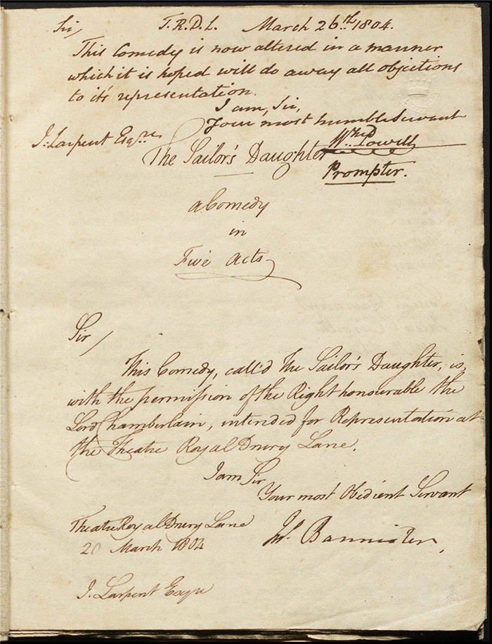The manuscript was submitted on 20 March 1804 by John Bannister. Anna Larpent recorded reading it on 21 March win her diary but offered no comment (HM 31201, vol 5: f.200r). After Larpent’s objections were dealt with, it was resubmitted on 26 March by William Powell, the prompter, who wrote in a cover note ‘This Comedy is now altered in a manner which it is hoped will do away all objections to its’ representation’ [n.f.] The play was first performed at Drury Lane Theatre on 7 April 1804.