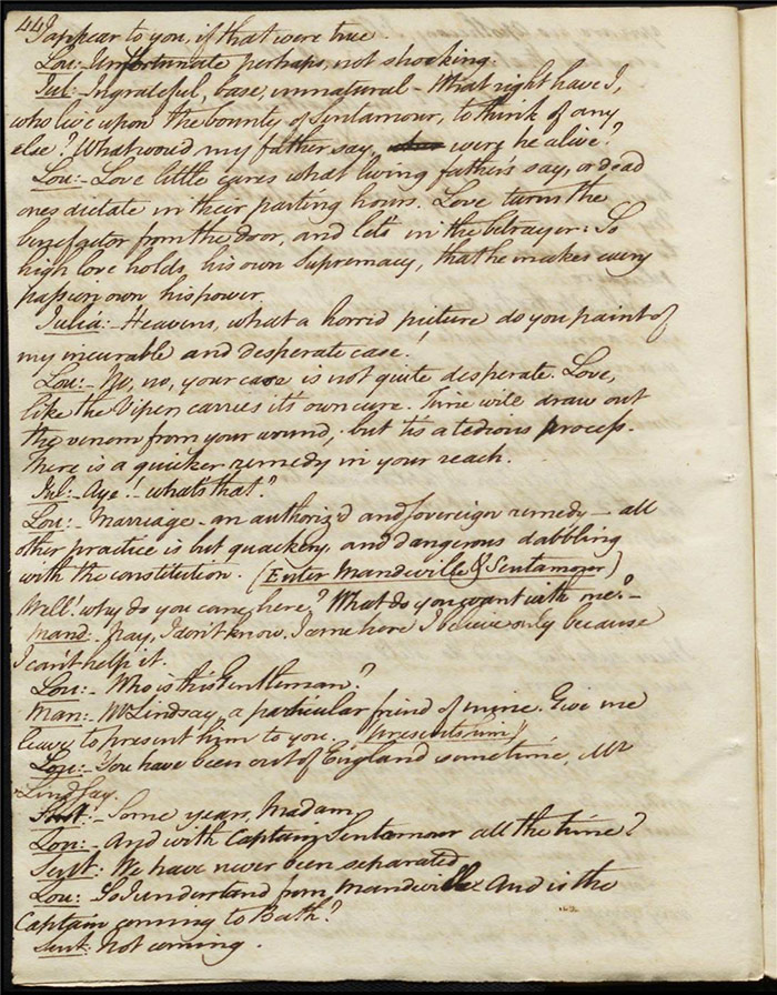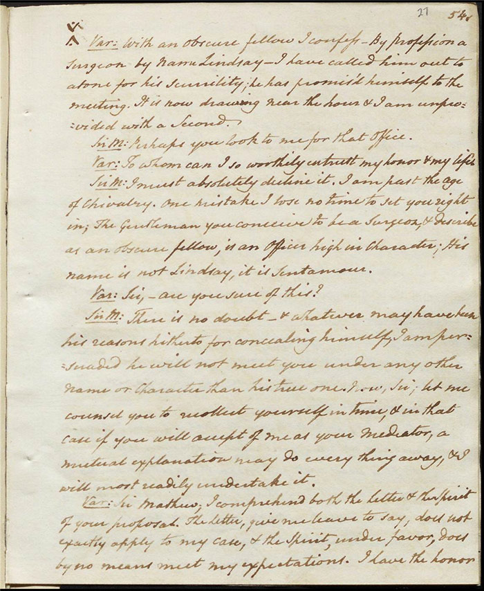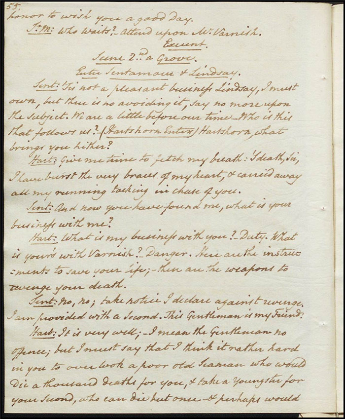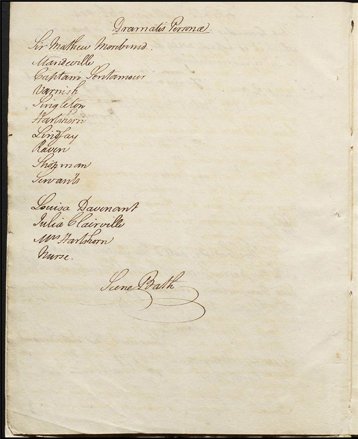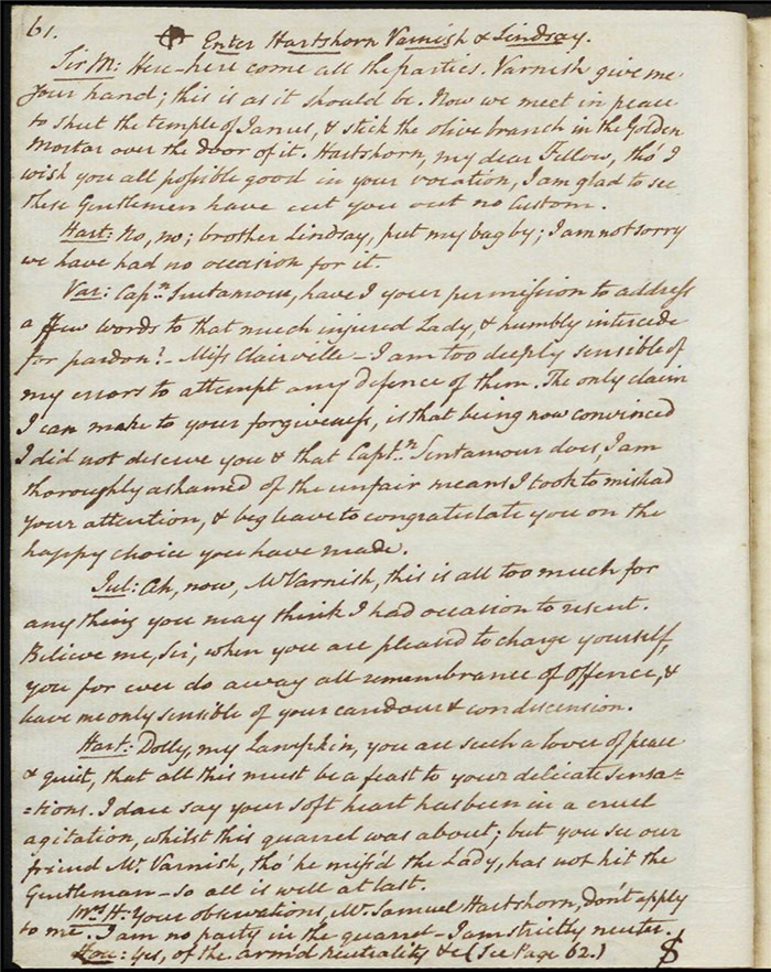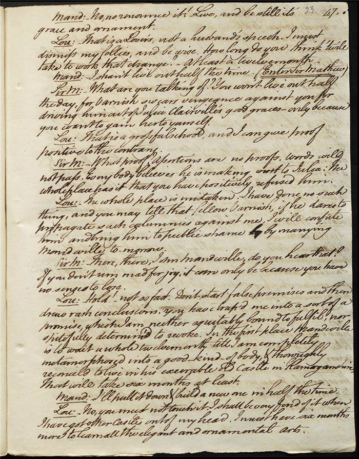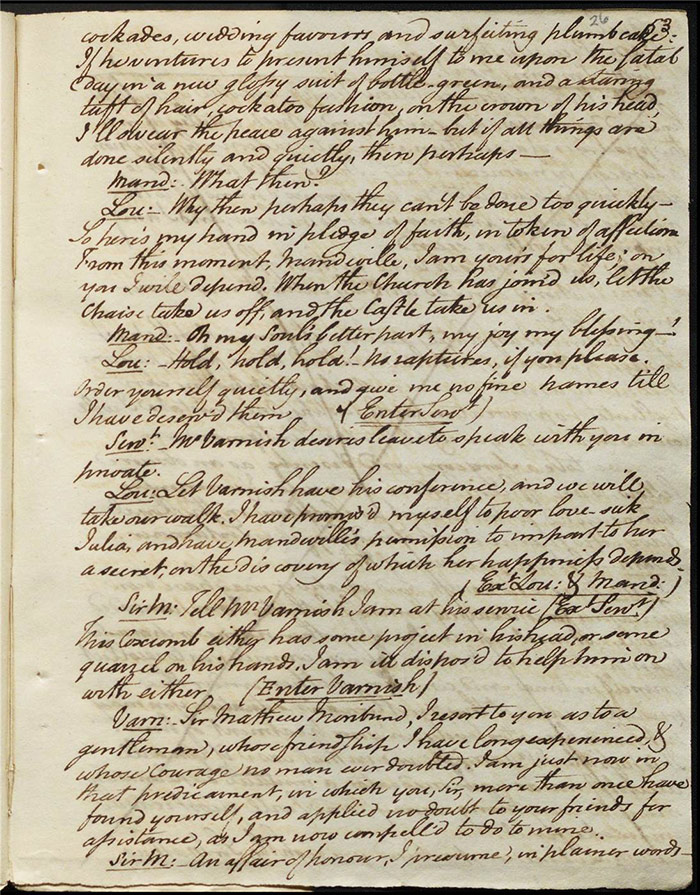 In the concluding act, Sir Matthew is delighted that Mandeville and Louisa are to be married as it saves him the trouble of producing an heir (f.25r) [The plot given here is that of the play as performed; extensive revisions to this final act were demanded by Larpent and these are documented in the ‘Commentary’ section]. Louisa tells Mandeville they can be married straight away if there is a simple ceremony without any fuss. Varnish enters and tells Sir Matthew that he needs him as a second for a duel with Lindsay. Sir Matthew explains that Lindsay is actually Sentamour. Sentamour and Lindsay await Varnish in a grove (f.27v). Hartshorn enters and offers to be his second but Sentamour explains that he already has one. Varnish arrives and, after a lengthy discussion about the demands of honour, the pair agree to abandon the duel. Varnish withdraws any claims on Julia and offers to leave for Bath. Sentamour advises him to stay in town to avoid any accusations of cowardice. Julia explains to Louisa that Lindsay is actually Sentamour and that he is in love with her (f.32r). Mandeville, Sir Matthew, Varnish and Lindsay all enter, reconciled. Sentamour enters and presents himself to Louisa.