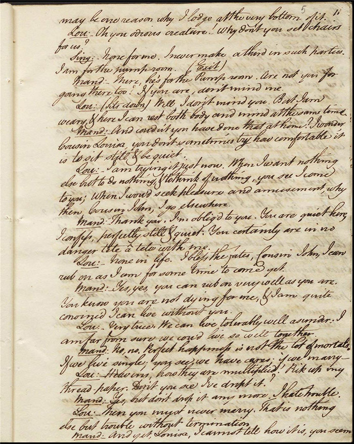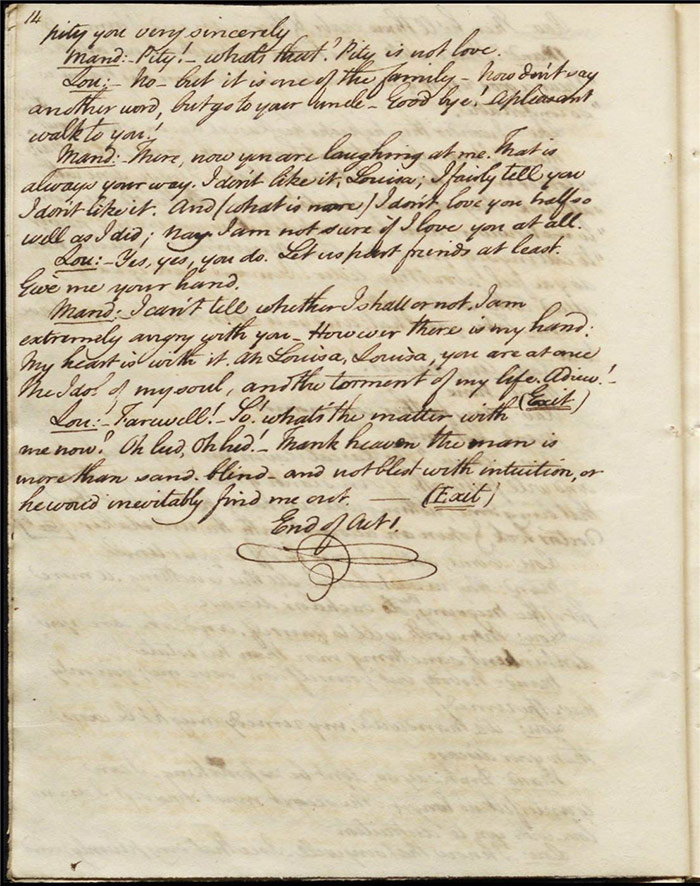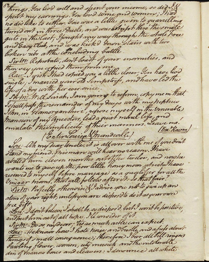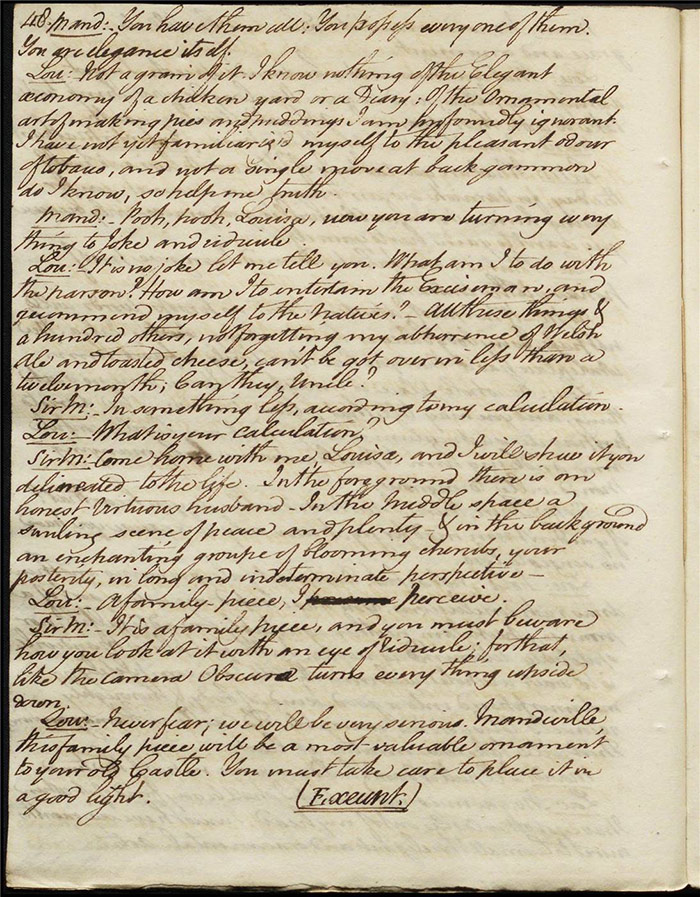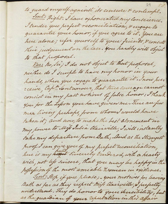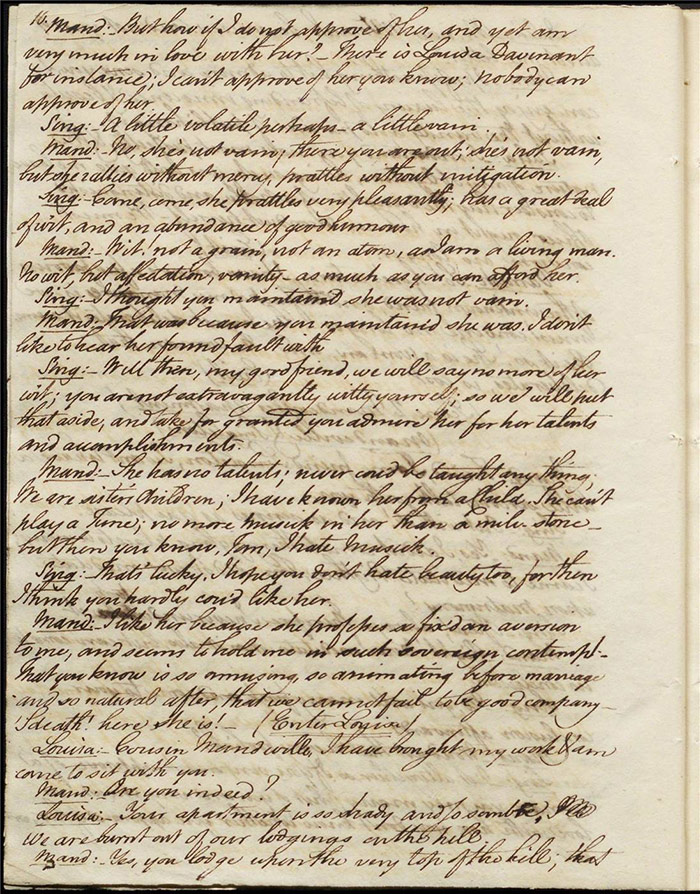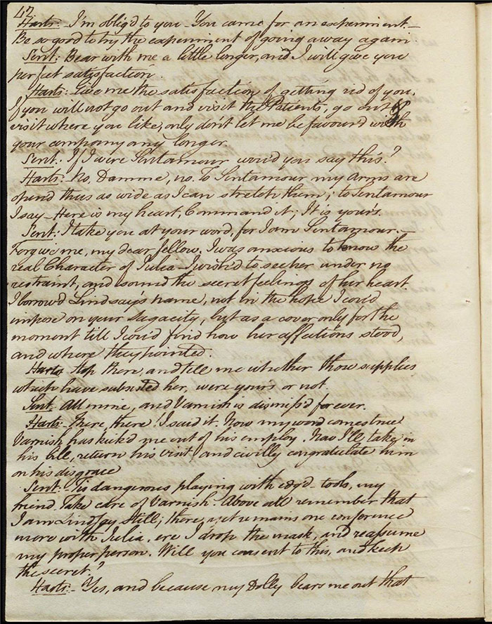 In the concluding act, Sir Matthew is delighted that Mandeville and Louisa are to be married as it saves him the trouble of producing an heir (f.25r) [The plot given here is that of the play as performed; extensive revisions to this final act were demanded by Larpent and these are documented in the ‘Commentary’ section]. Louisa tells Mandeville they can be married straight away if there is a simple ceremony without any fuss. Varnish enters and tells Sir Matthew that he needs him as a second for a duel with Lindsay. Sir Matthew explains that Lindsay is actually Sentamour. Sentamour and Lindsay await Varnish in a grove (f.27v). Hartshorn enters and offers to be his second but Sentamour explains that he already has one. Varnish arrives and, after a lengthy discussion about the demands of honour, the pair agree to abandon the duel. Varnish withdraws any claims on Julia and offers to leave for Bath. Sentamour advises him to stay in town to avoid any accusations of cowardice. Julia explains to Louisa that Lindsay is actually Sentamour and that he is in love with her (f.32r). Mandeville, Sir Matthew, Varnish and Lindsay all enter, reconciled. Sentamour enters and presents himself to Louisa.