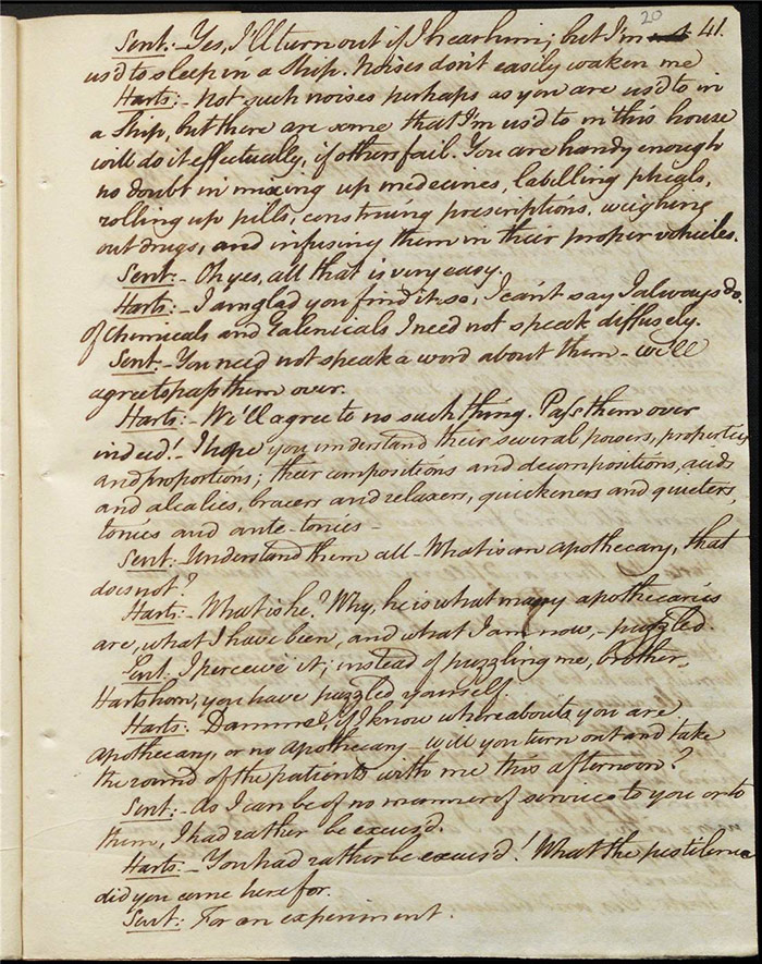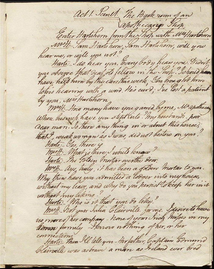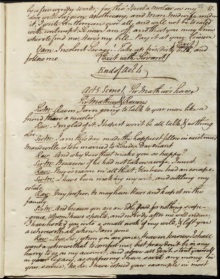 Hartshorn, an apothecary, quarrels with his wife. She wants rid of his beautiful ward, Julia, orphaned daughter of his Irish friend but he is unbending in his duty. He tells Julia that she is promised to her father’s protégé, Sentamour, a navy captain. He further suspects that Sentamour is Julia’s anonymous benefactor. However, the devious Varnish, who has designs on her, intimates that he might be the mysterious sponsor. Mandeville discusses marriage with his friend Singleton (f.4r). He admires Louisa but she is too vain for him. She enters and they quarrel. Raven delivers a letter from Mandeville’s uncle Sir Matthew Moribund. He claims that he is dying and, after consulting a host of doctors, Hartshorn represents his last chance. He asks that Mandeville attend him. Despite believing that this is all nonsense, Mandeville leaves to go to him but not before he declares his love to an apparently indifferent Louisa.