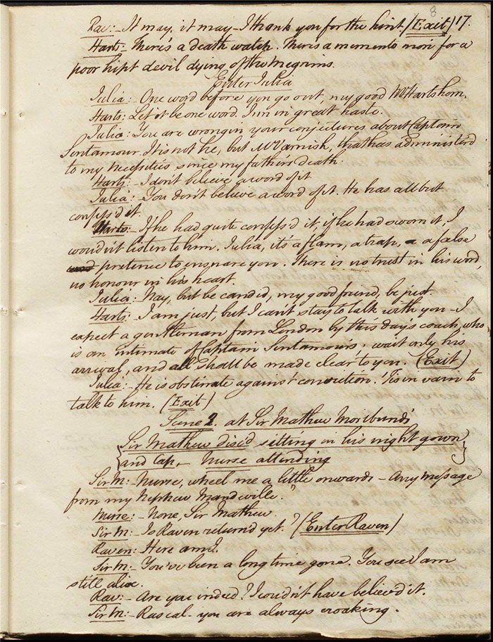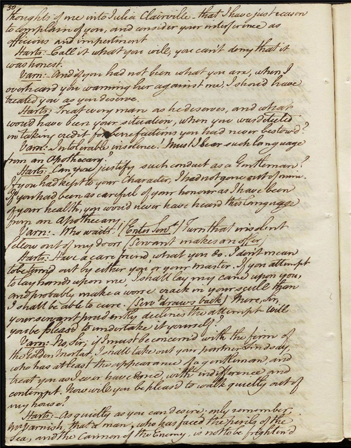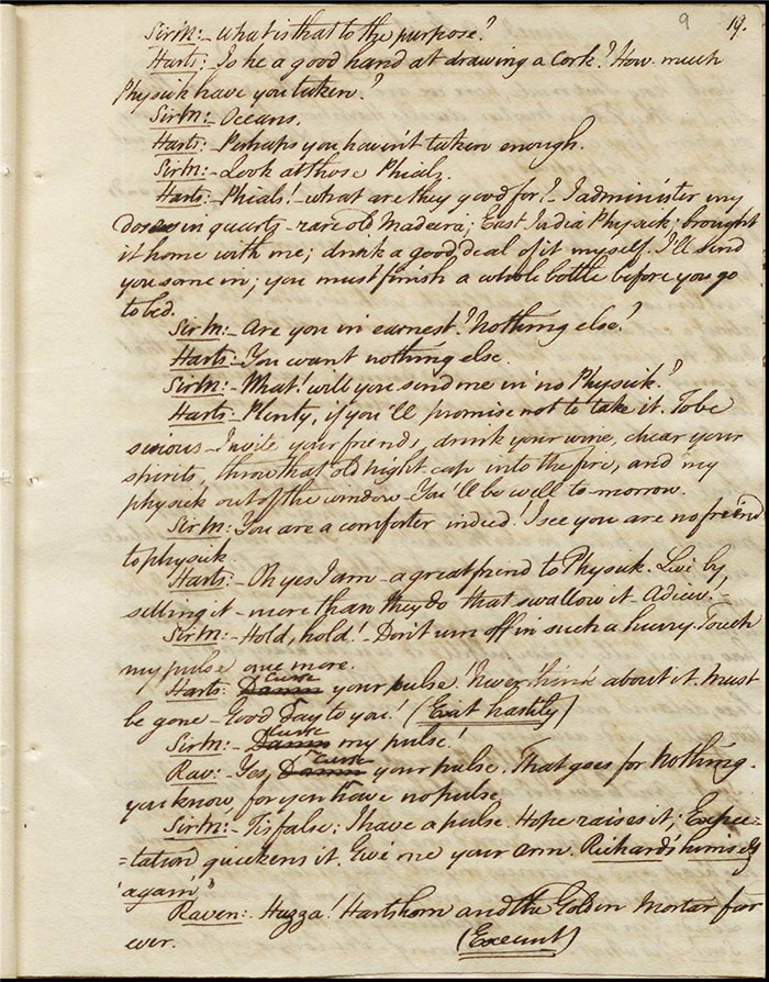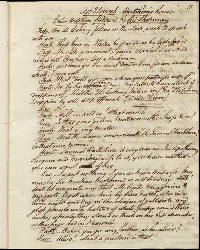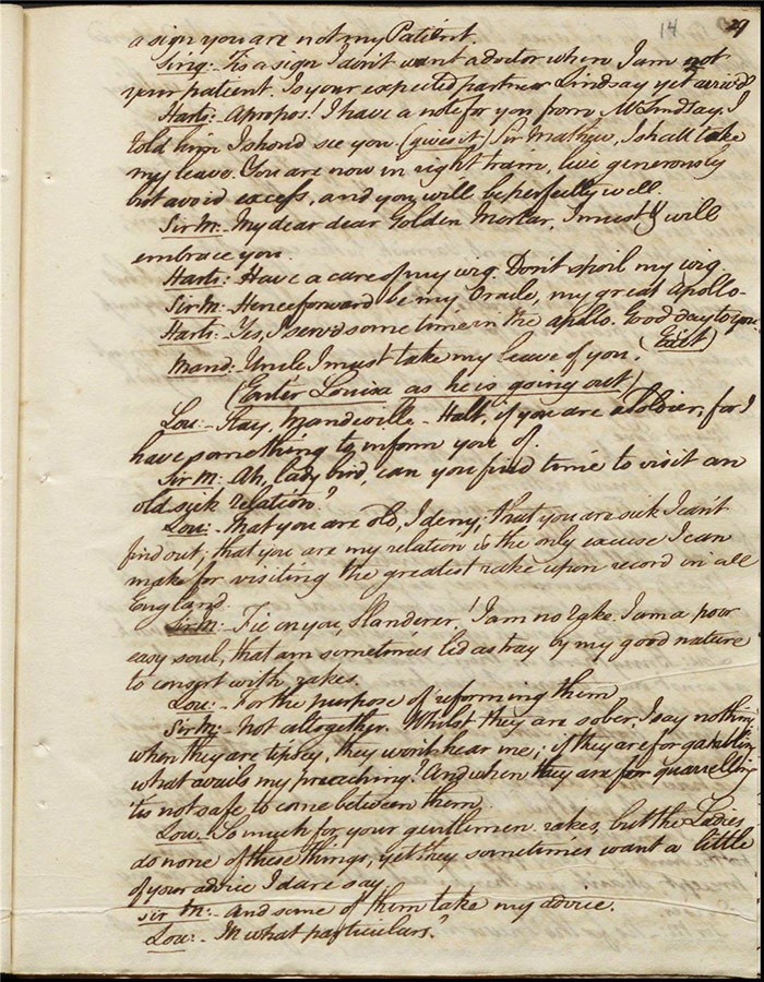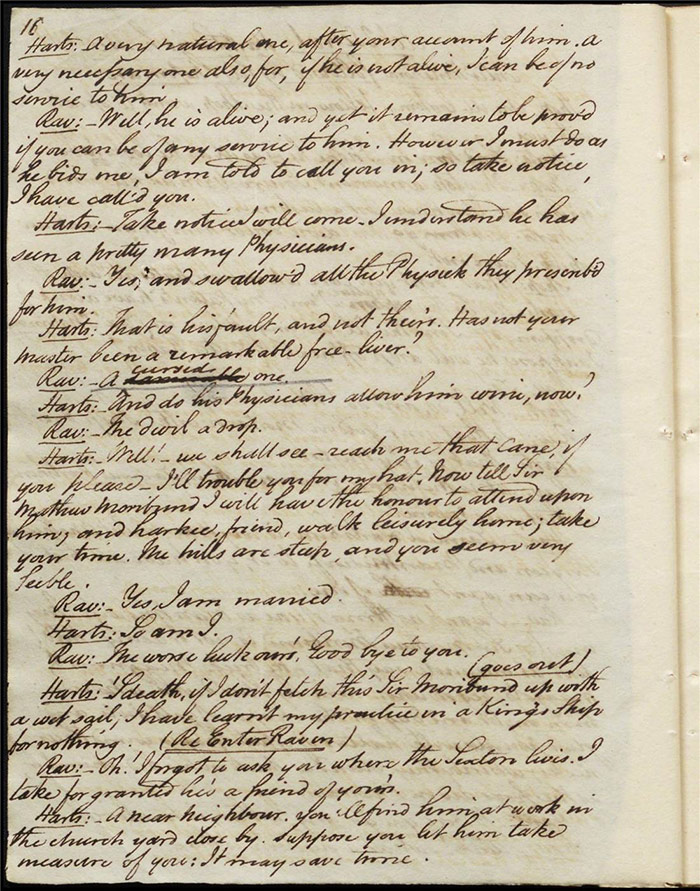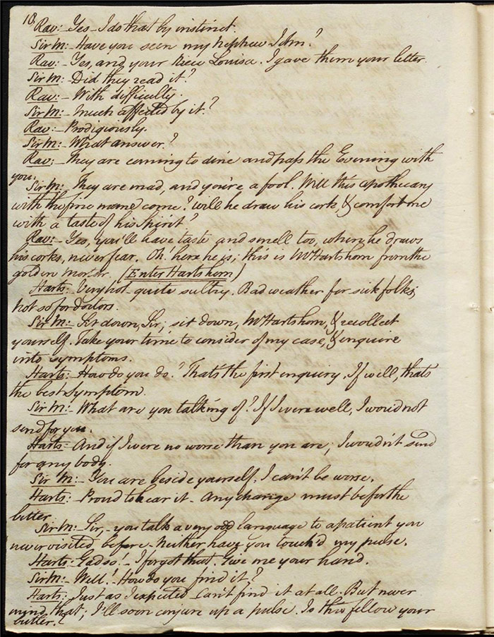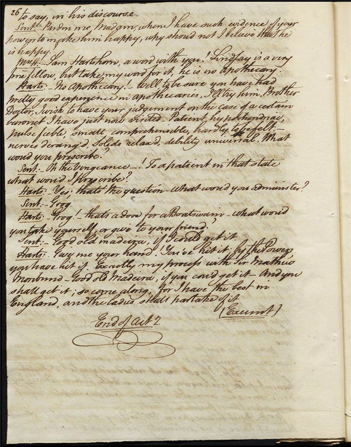 Raven calls on Hartshorn to request his services when act 2 opens; he agrees (f.7r). Julia tells Hartshorn that Varnish is in fact her secret benefactor but he dismisses the claim as a lie. Raven arrives back to Sir Matthew to tell him that Mandeville and Louisa are coming (f.8r). Hartshorn arrives and prescribes a bottle of Madeira for the skeptical Sir Matthew. Sentamour and his friend Lindsay arrive in Bath (f.9v). Sentamour determines to disguise himself as Lindsay to better gauge the true worth of Julia’s character by pretending to be a prospective assistant to Hartshorn. We also learn that he was indeed her true benefactor. Mrs Hartshorn puts pressure on Julia to go to Varnish (f.10v). Sentamour, as Lindsay, arrives. Julia and he talk and she simultaneously indicates that Varnish provides her with aid and that she will never marry him. Hartshorn enters and tests Sentamour’s credentials by describing Sir Matthew’s symptoms and asking for a prescription. He is delighted when Sentamour suggests grog or Madeira.