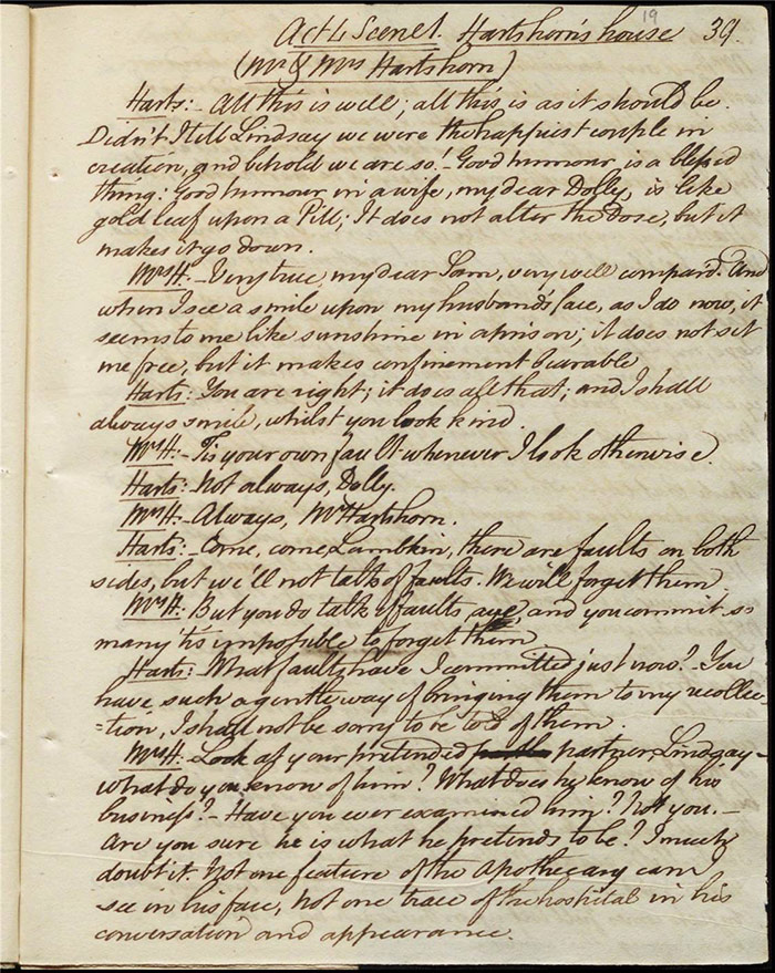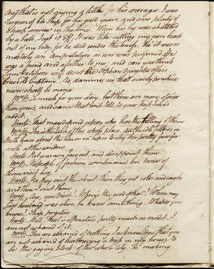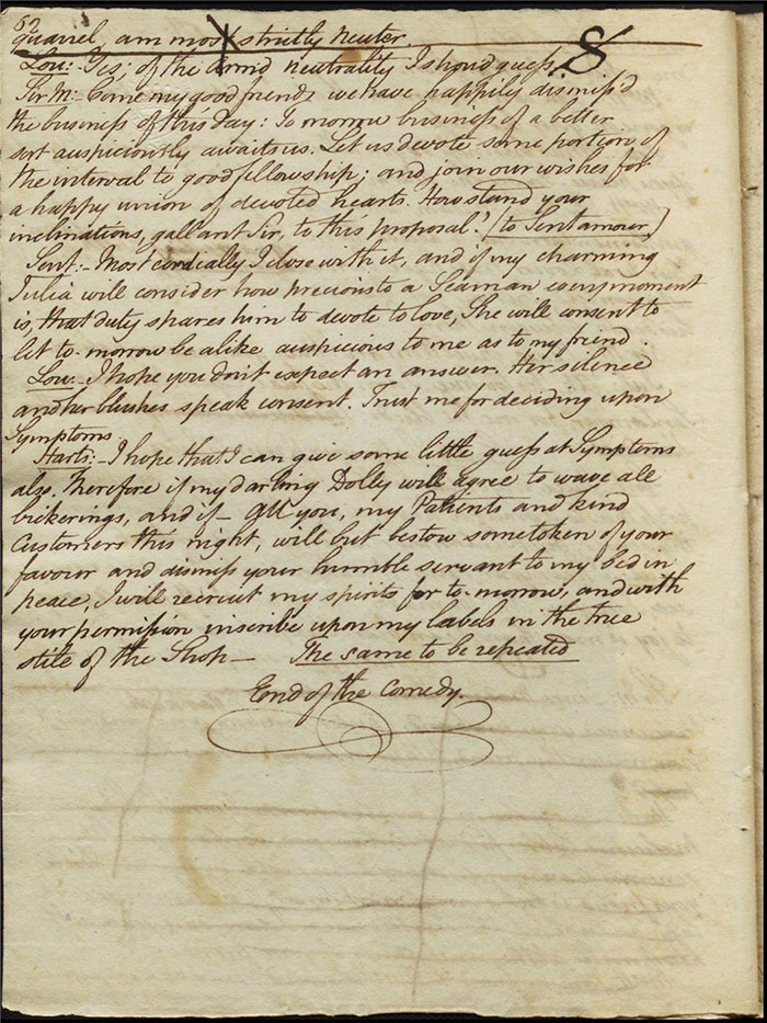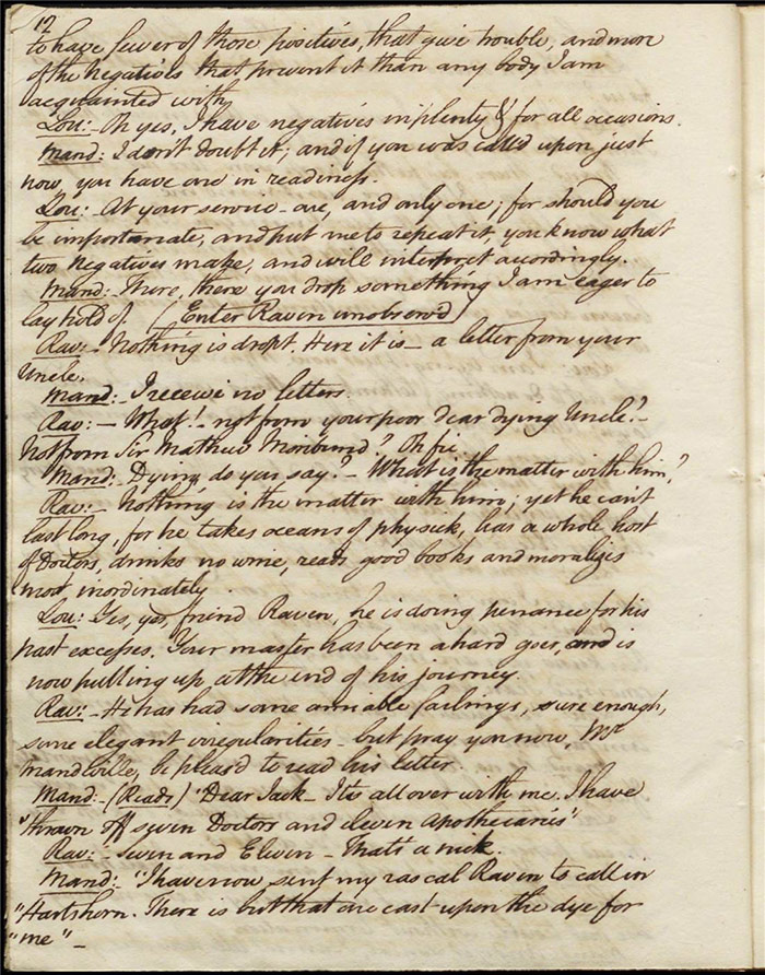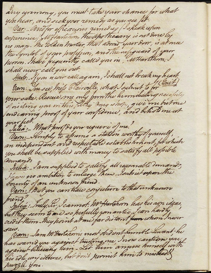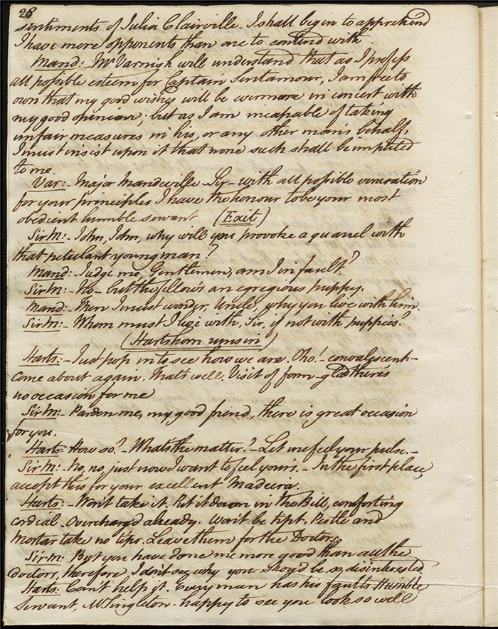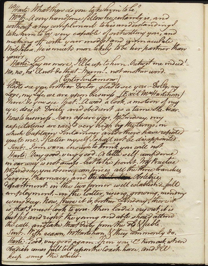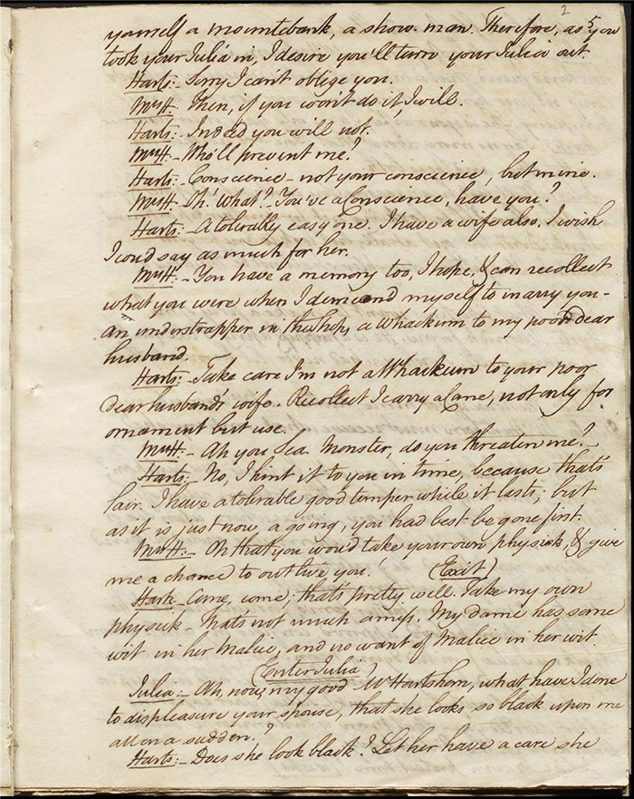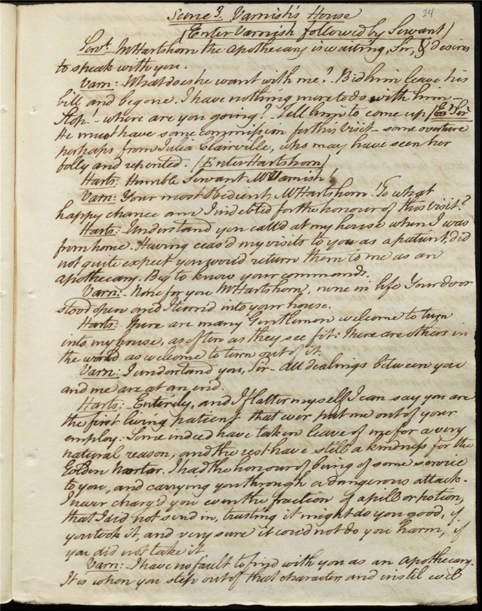 Raven calls on Hartshorn to request his services when act 2 opens; he agrees (f.7r). Julia tells Hartshorn that Varnish is in fact her secret benefactor but he dismisses the claim as a lie. Raven arrives back to Sir Matthew to tell him that Mandeville and Louisa are coming (f.8r). Hartshorn arrives and prescribes a bottle of Madeira for the skeptical Sir Matthew. Sentamour and his friend Lindsay arrive in Bath (f.9v). Sentamour determines to disguise himself as Lindsay to better gauge the true worth of Julia’s character by pretending to be a prospective assistant to Hartshorn. We also learn that he was indeed her true benefactor. Mrs Hartshorn puts pressure on Julia to go to Varnish (f.10v). Sentamour, as Lindsay, arrives. Julia and he talk and she simultaneously indicates that Varnish provides her with aid and that she will never marry him. Hartshorn enters and tests Sentamour’s credentials by describing Sir Matthew’s symptoms and asking for a prescription. He is delighted when Sentamour suggests grog or Madeira.