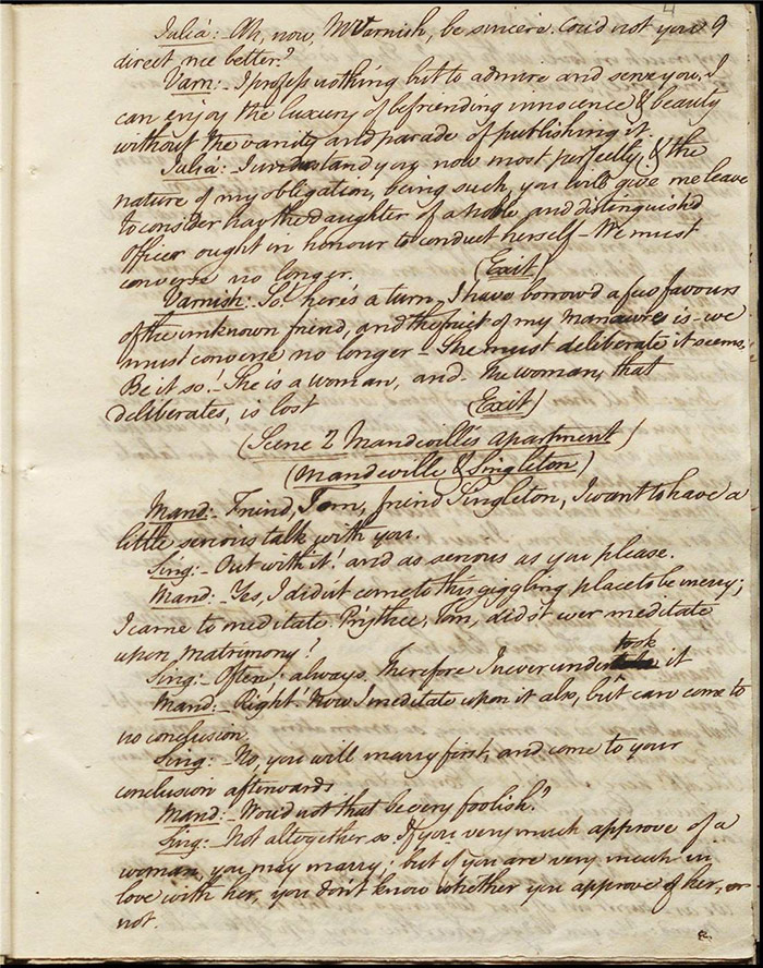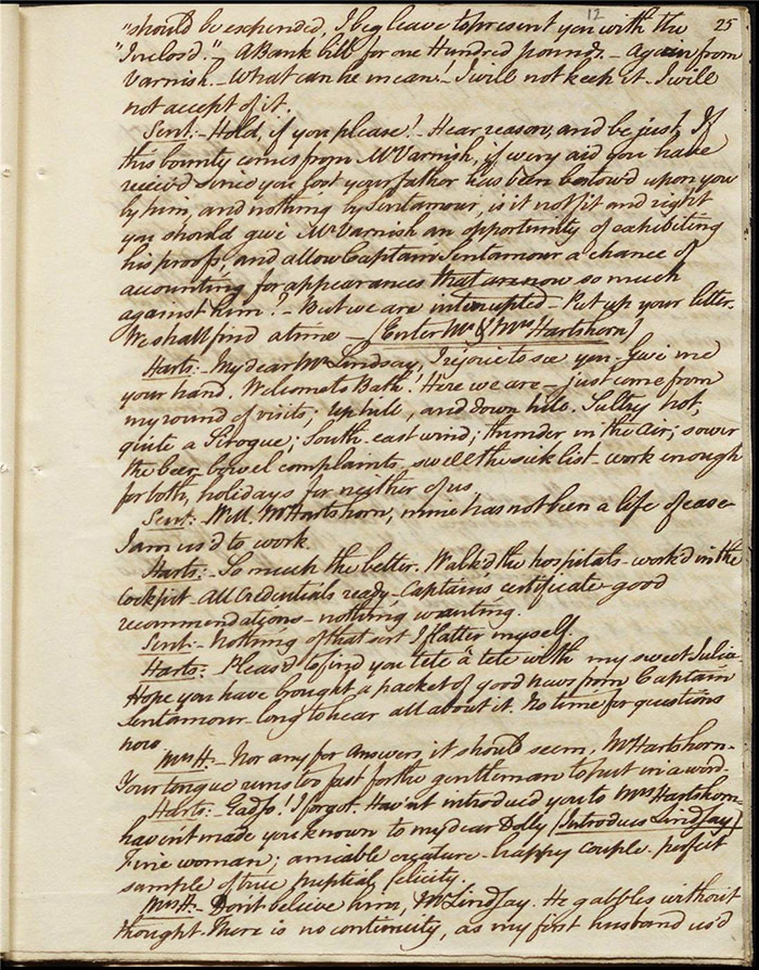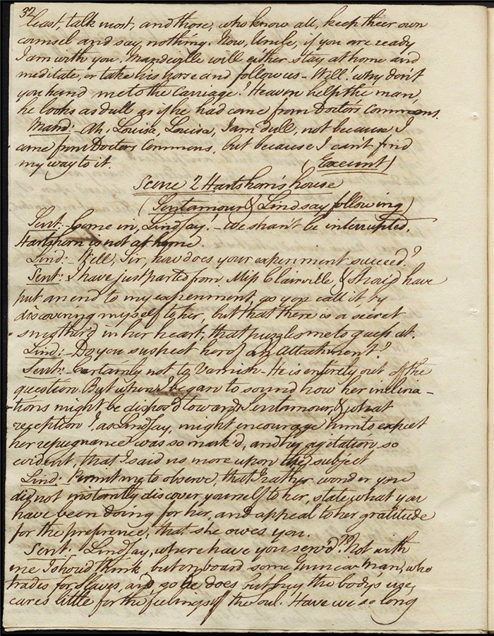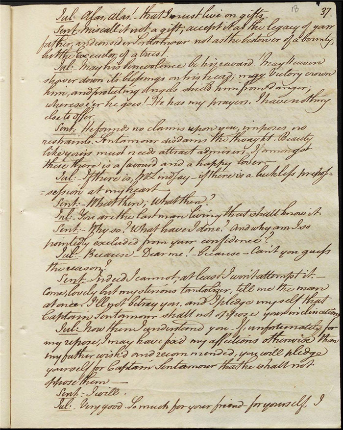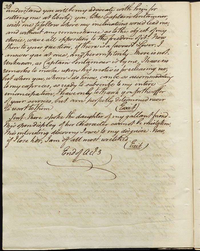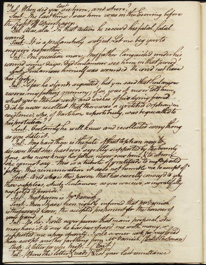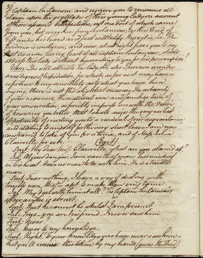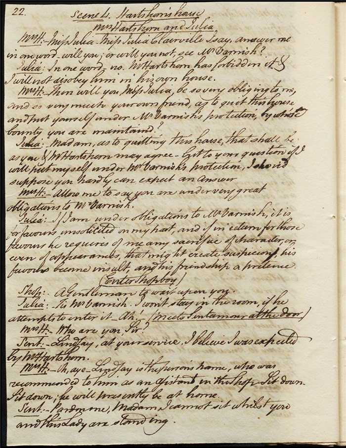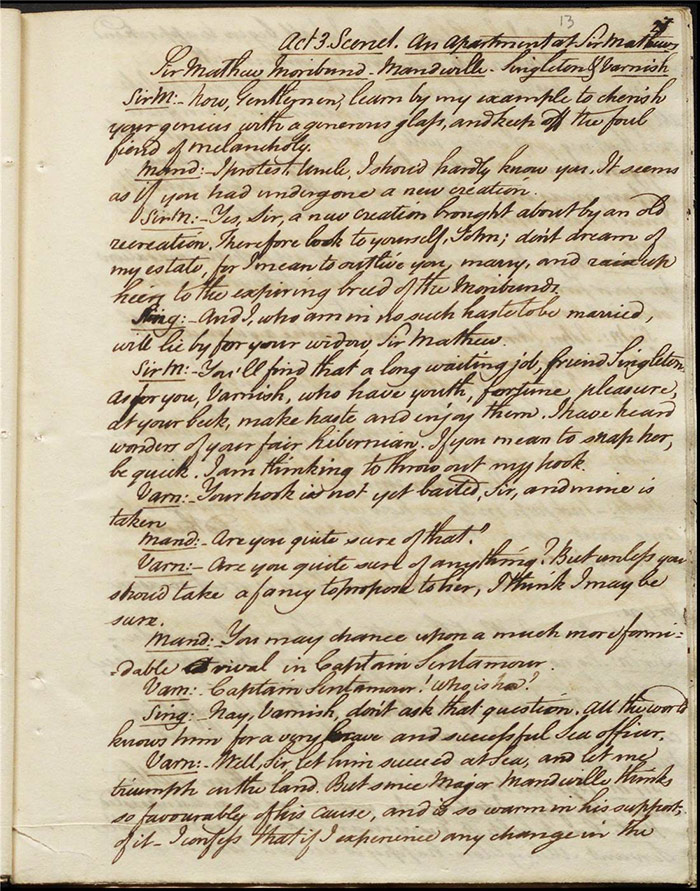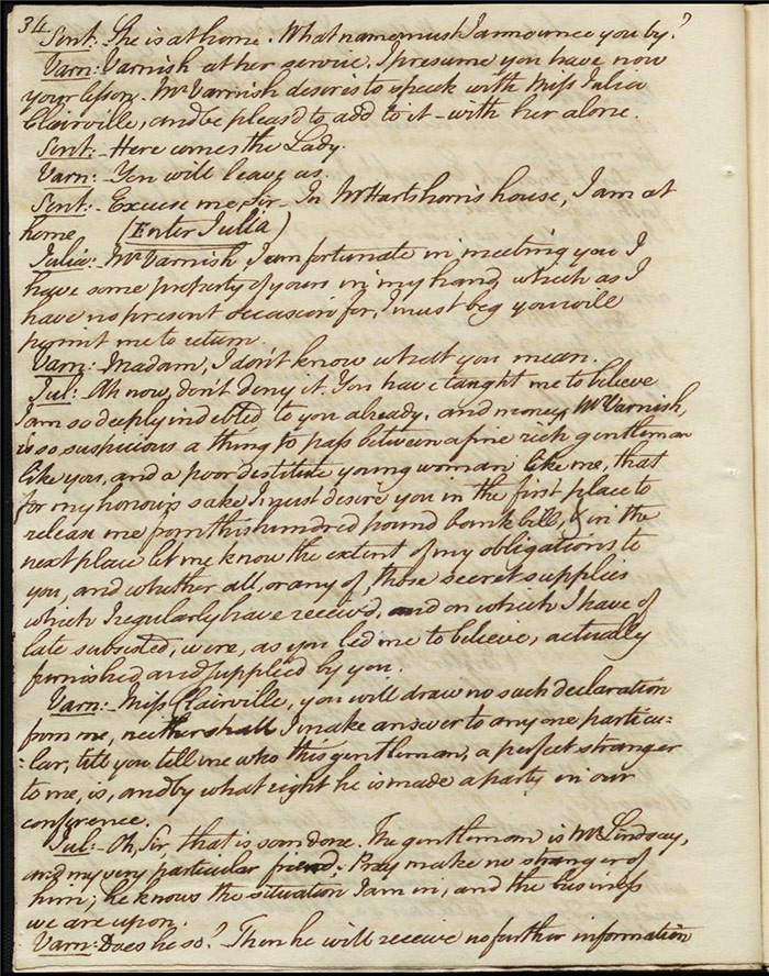 In act 3, a rejuvenated Sir Matthew declares that he might get married, perhaps even to Julia (f.13r). Mandeville tells Varnish about Sentamour. Hartshorn gives a note from Sentamour (as Lindsay) to Mandeville. Louisa reports that Julia has been upset at meeting someone who knew her father. Sir Matthew recommends that everyone get married. Sentamour meets Lindsay at Hartshorn’s and declares that he is giving up on Julia as she loves another (f.15v). Varnish arrives and Lindsay leaves. Varnish is looking for Julia. She appears and tries to give Varnish a £100 bill in order to free herself of any obligation to him. Sentamour, without revealing his identity, demands that Varnish admit he is no benefactor and renounce his claim to Julia. Varnish leaves, threatening the captain. Julia intimates that she is in love with Sentamour.