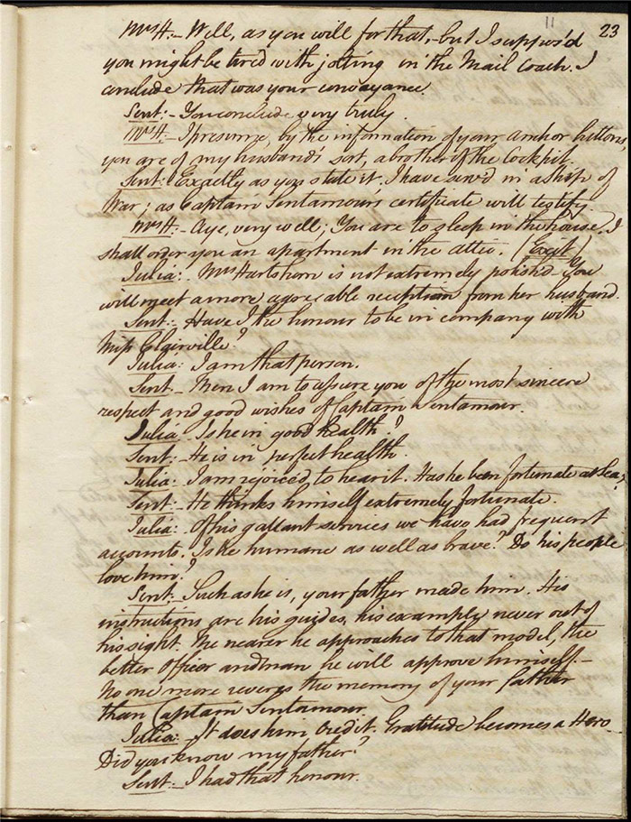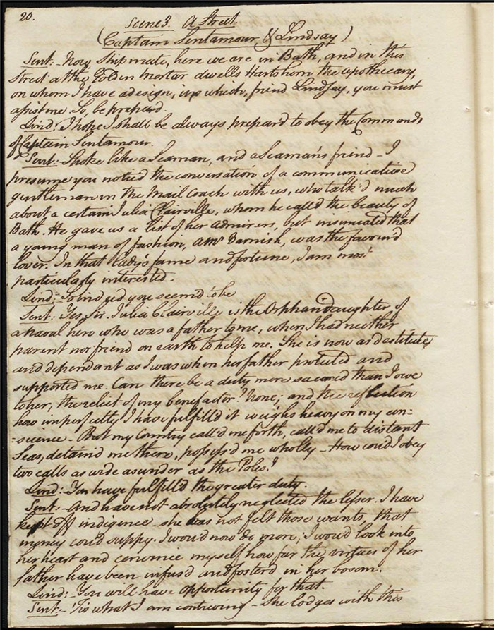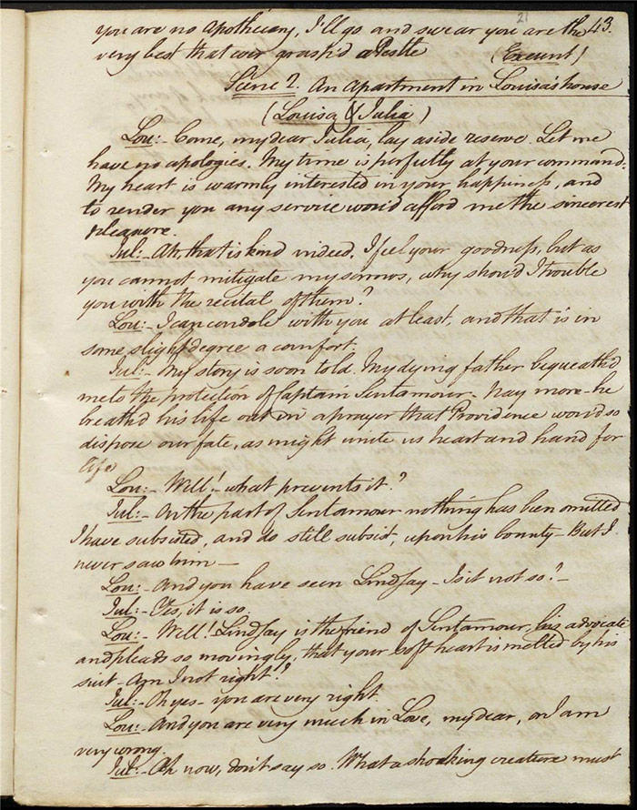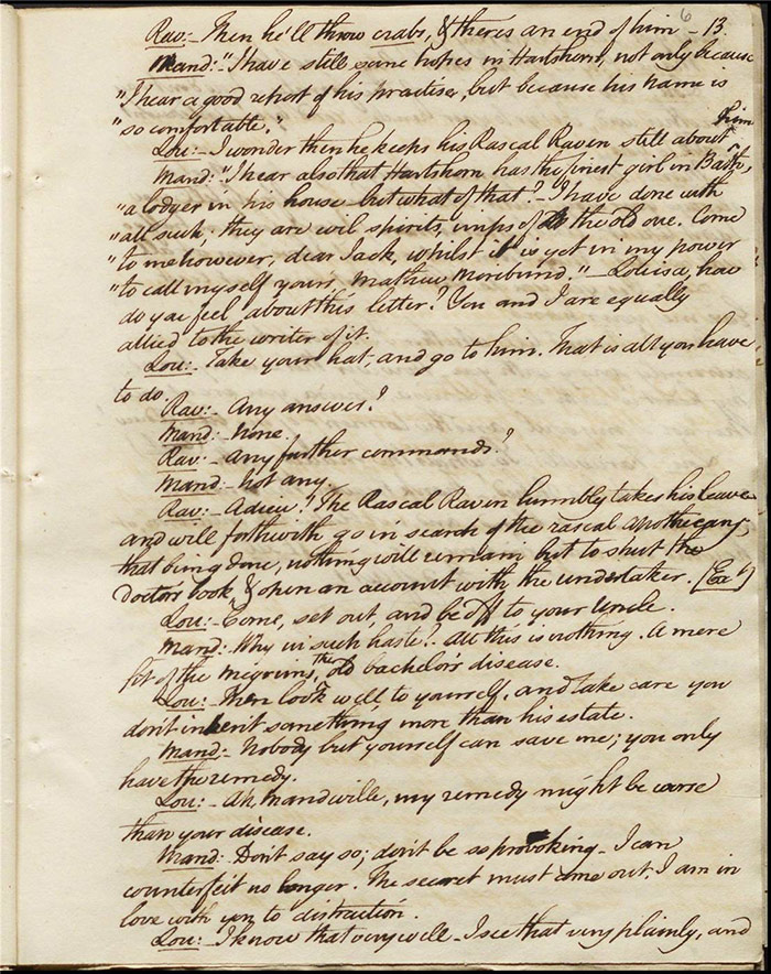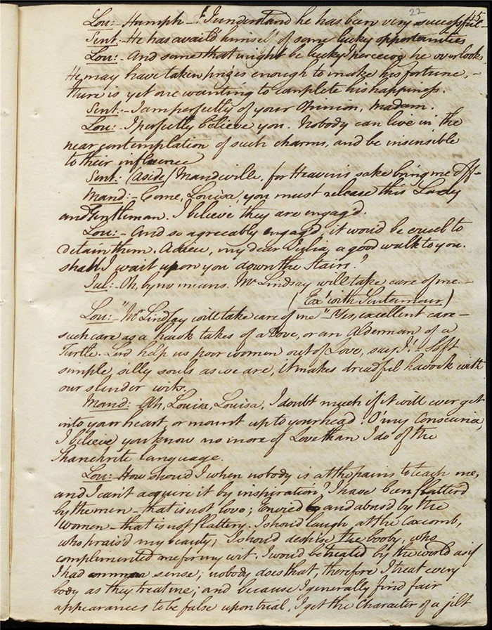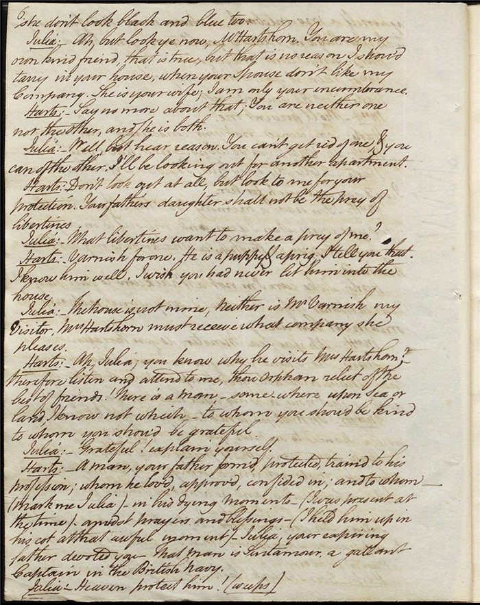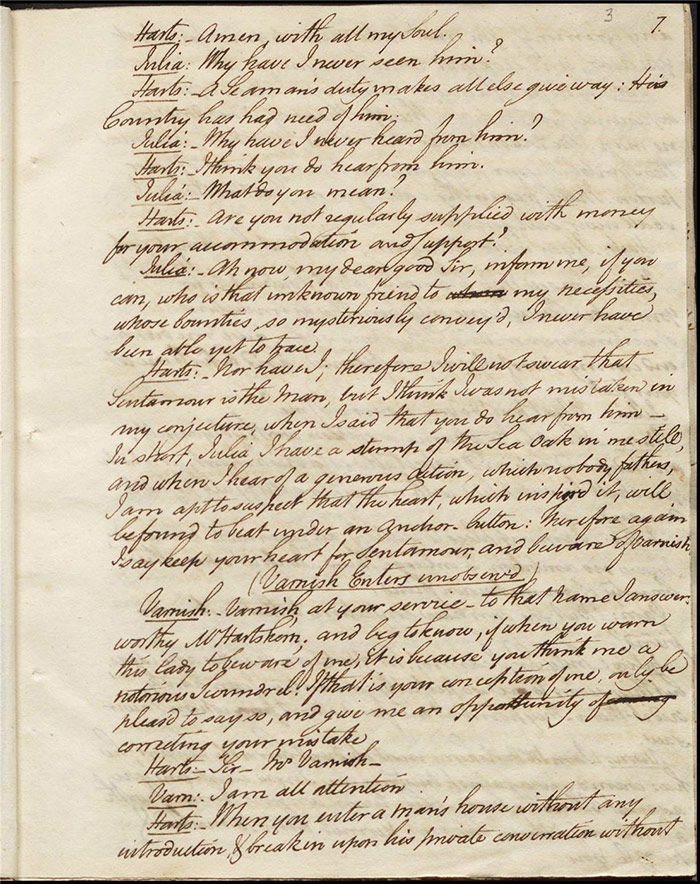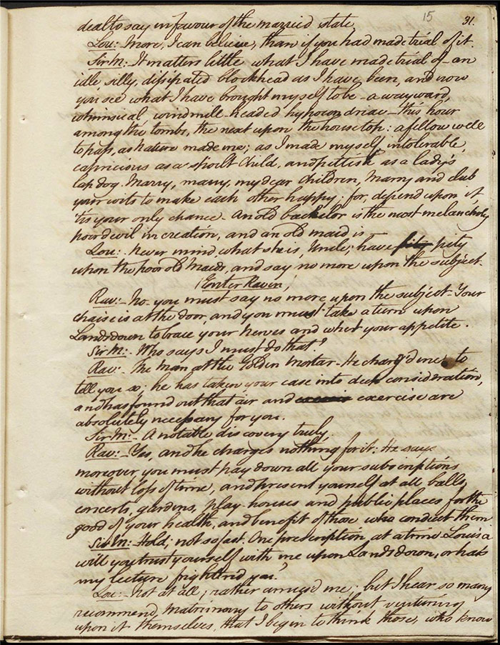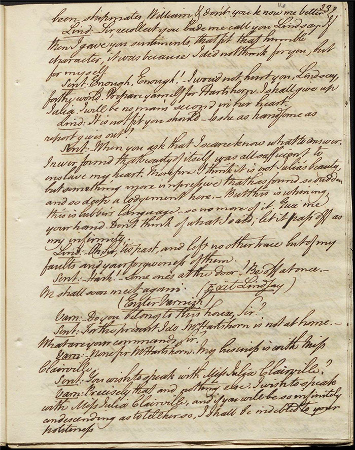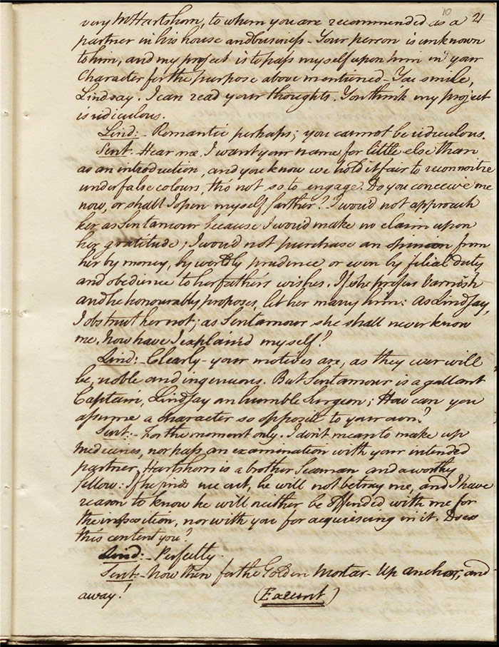 In act 3, a rejuvenated Sir Matthew declares that he might get married, perhaps even to Julia (f.13r). Mandeville tells Varnish about Sentamour. Hartshorn gives a note from Sentamour (as Lindsay) to Mandeville. Louisa reports that Julia has been upset at meeting someone who knew her father. Sir Matthew recommends that everyone get married. Sentamour meets Lindsay at Hartshorn’s and declares that he is giving up on Julia as she loves another (f.15v). Varnish arrives and Lindsay leaves. Varnish is looking for Julia. She appears and tries to give Varnish a £100 bill in order to free herself of any obligation to him. Sentamour, without revealing his identity, demands that Varnish admit he is no benefactor and renounce his claim to Julia. Varnish leaves, threatening the captain. Julia intimates that she is in love with Sentamour.