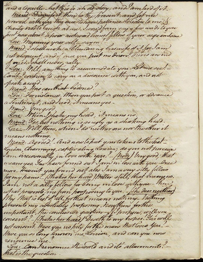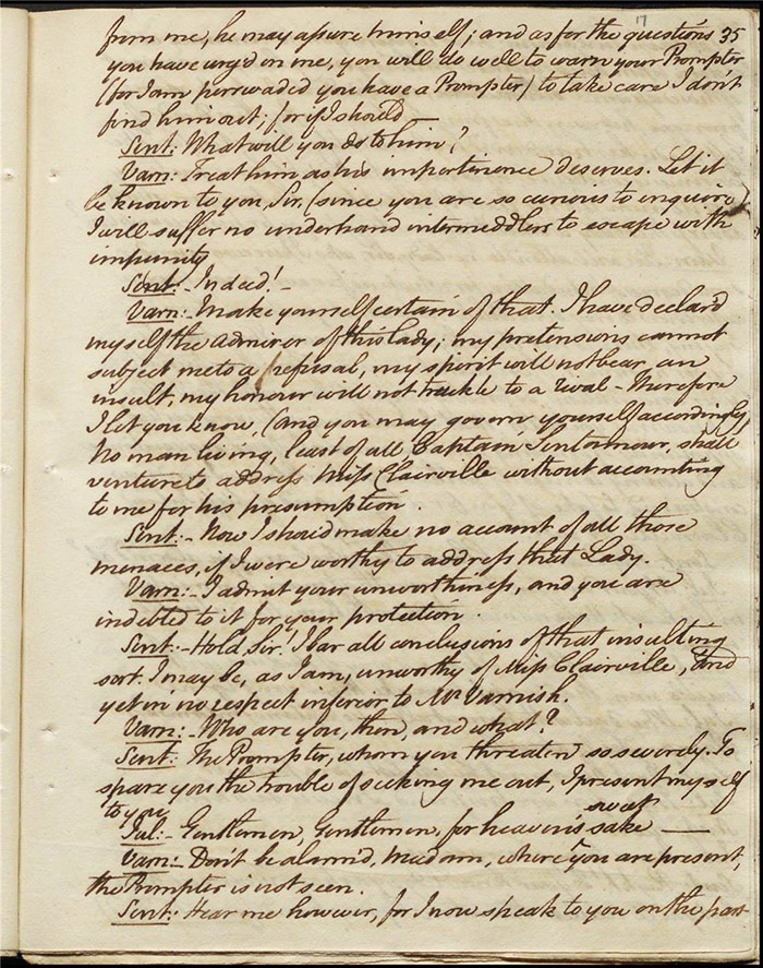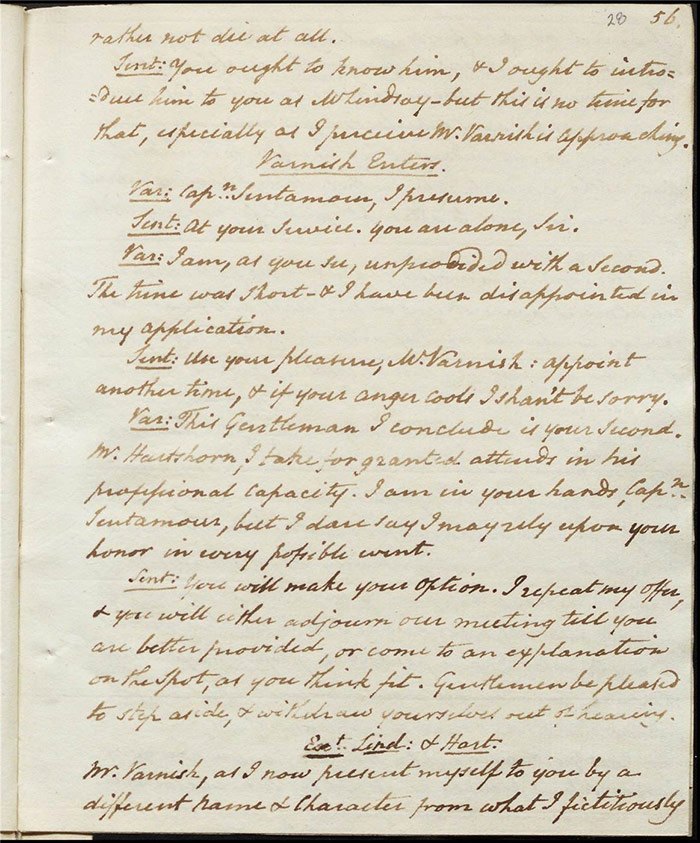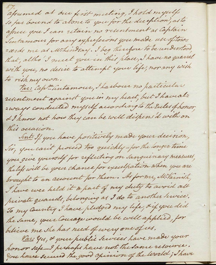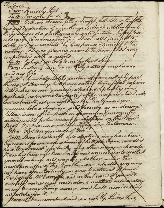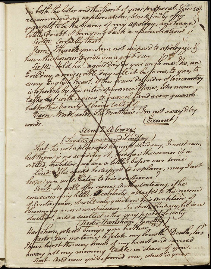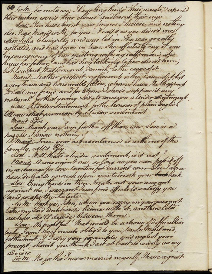 Larpent’s sensitivity around the depiction of dueling and the language used to describe it and its real-life practitioners must be understood in the context of this high-profile event. The few lines that are underlined in pencil are on (f.30r). Here Sir Matthew is attempting to make the peace between Varnish and Captain Sentamour and he addresses the former: