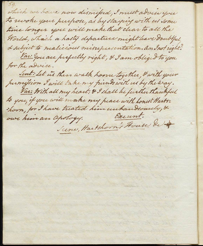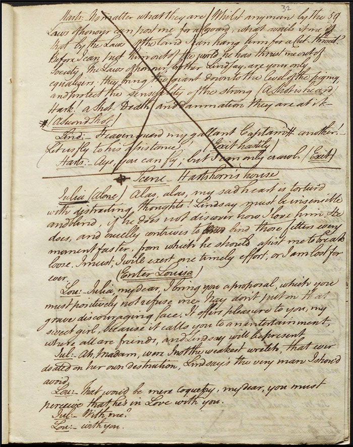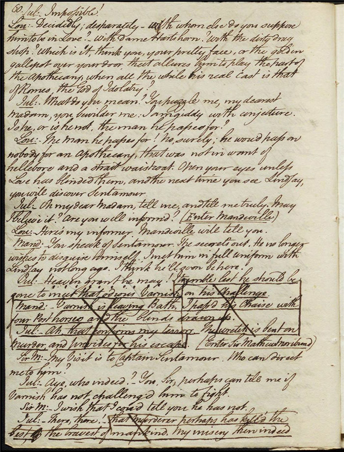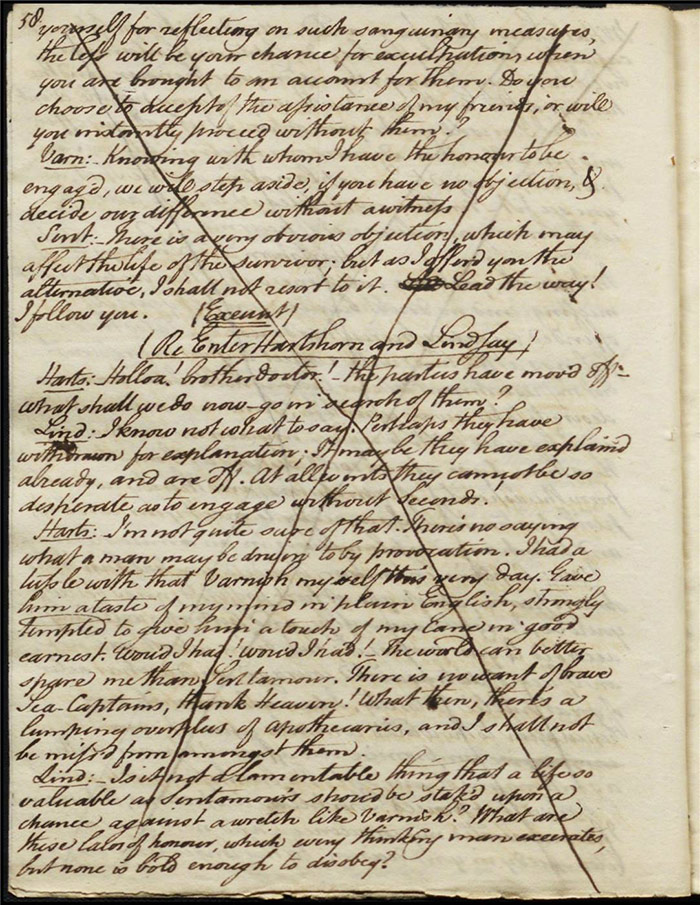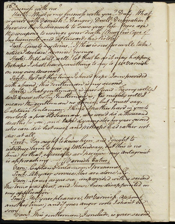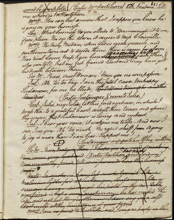 The next folio (f.30v) also reveals some pencil marks scored through dialogue relating to the duel that may indicate a growing general disapprobation of the theme on Larpent’s part. Certainly, the deletion of the entire folio and those following make clear that Cumberland’s intended critique of dueling culture misfired. The original plot has the duel proceeding with both Varnish and Sentamour essentially admitting that they are obliged to do so—despite their rational misgivings—due to rigid laws of honour. A passage on (f.34r) which is marked for particular attention (by Larpent?) with a symbol and every line scored out individually had Hartshorn tell the ensemble how the duel unfolded. The possibility of the audience understanding this as what was supposed to have transpired between Camelford and Best was clearly very troubling for Larpent: