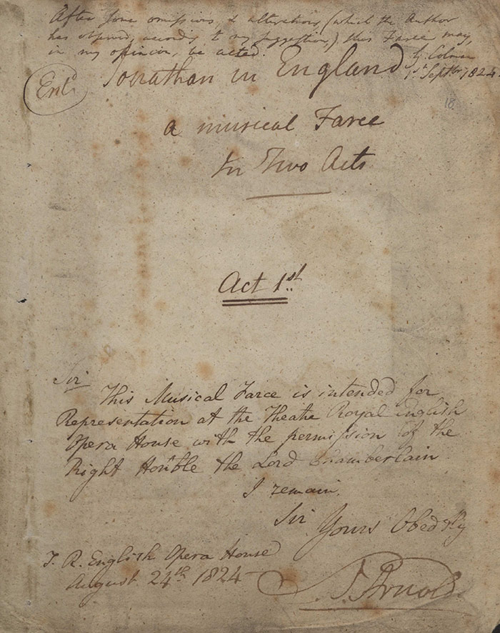 The comedy was first performed on 3 September 1823 at the English Opera House. The play was the second offshoot of Charles Mathews’s 1822-23 tour of America which had been very successful and established him as the leading comic actor of the day. However, while A Trip to America (1824) had pleased everyone, Jonathan in England, in which Mathew’s played Jonathan Doubikins, had a much more mixed reception.