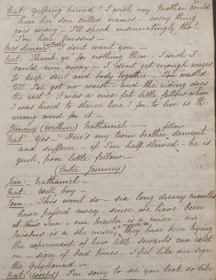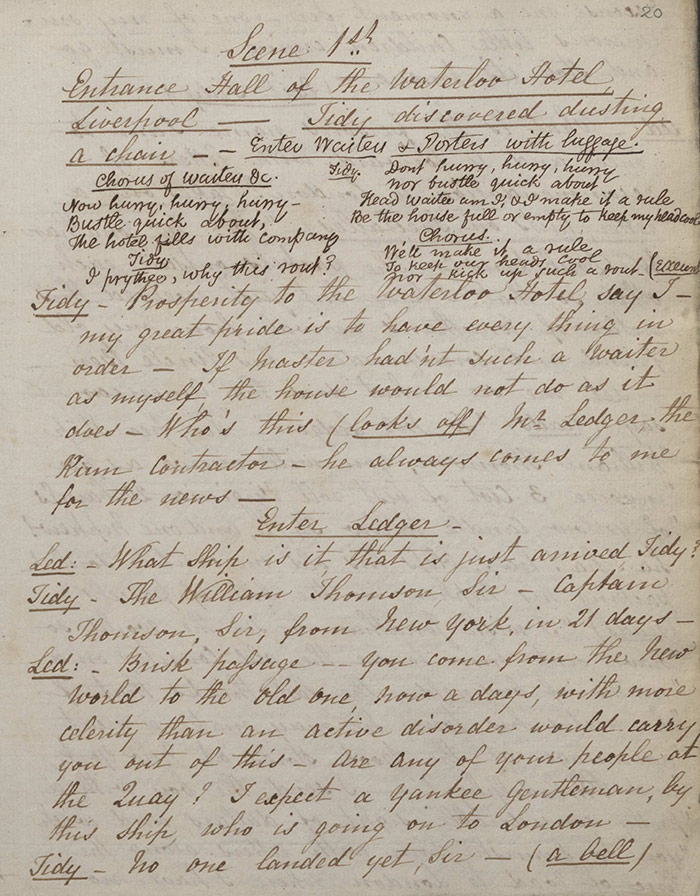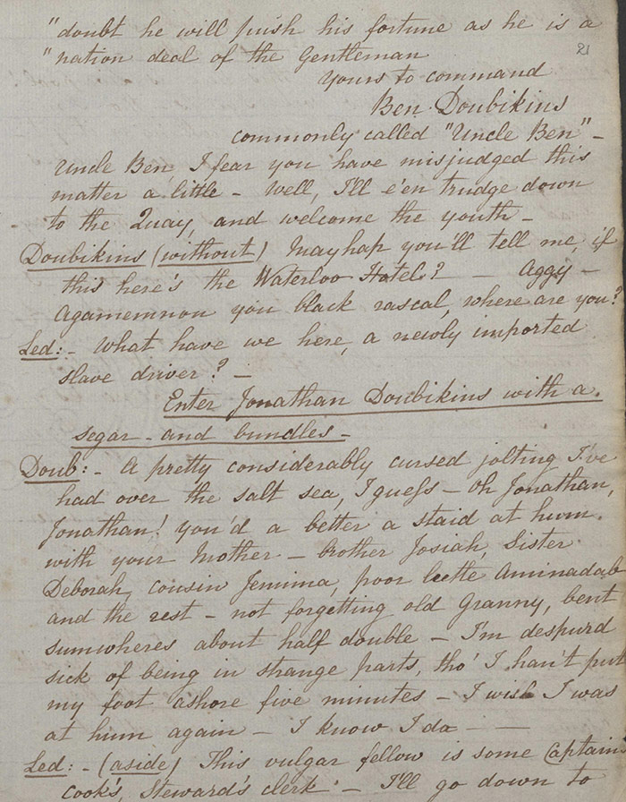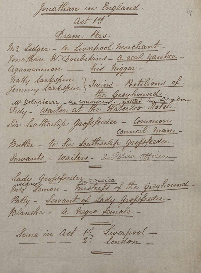 The opening scene takes place at the Waterloo Hotel in Liverpool where a waiter Tidy tells Mr Ledger that a ship from America has just docked. Ledger is expecting Jonathan Doubikins, the nephew of a friend of his. Jonathan is coming to England to see more of the world. He duly arrives but Ledger overhears his homesick speech so believes him to be of the lower orders and leaves to find him elsewhere. Tidy returns to find a disconsolate Jonathan who proceeds to record in his Observations on the British Nation various imagined shortcomings. Jonathan asks Tidy whether he has seen Agamemnon, his black slave whom he has brought to England to sell, much to Tidy’s amusement. Tidy eventually takes him elsewhere for a drink. Outside a small inn, the second scene sees Natty and Jemmy, two of the inn’s servants, bemoan their fate, working for the miserly Mr and Mrs Lemon (f.23v). They resolve to leave, plan to steal some food that night, and give their notice to an aghast Mrs Lemon. Natty is heading for London and Mr Ledger gives him a letter of recommendation for Sir Leatherlip Grossfeeder.