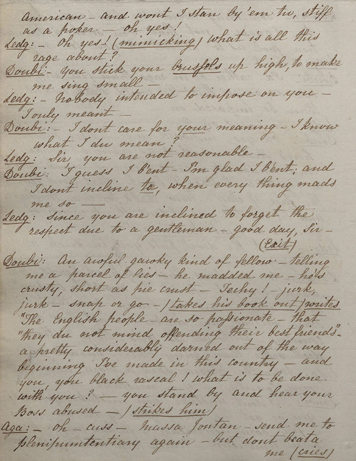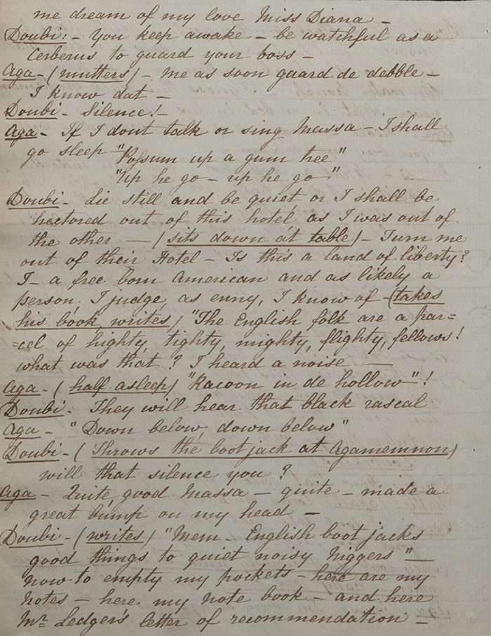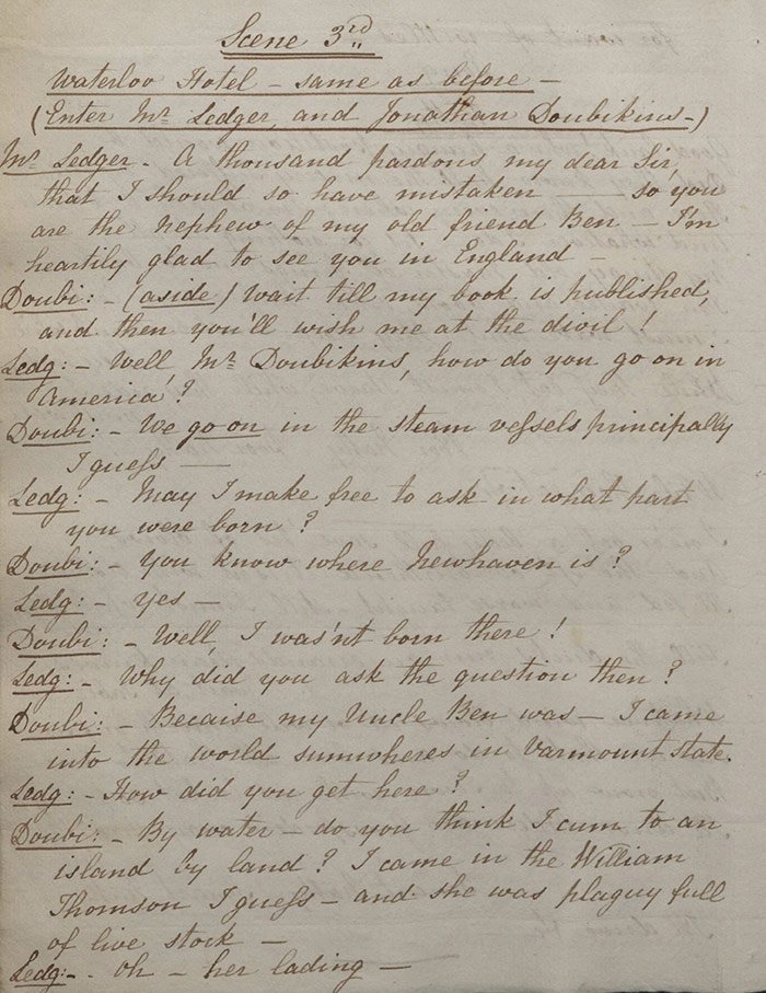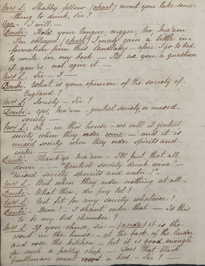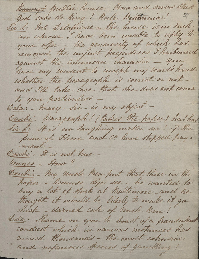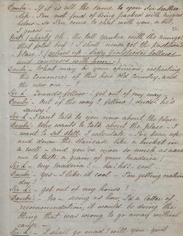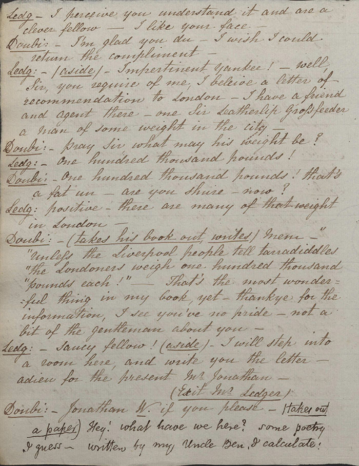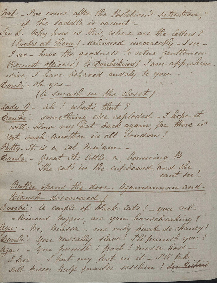 The second scene finds Lady Grossfeeder engrossed in her chemistry studies when Sir Leatherlip interrupts her with an account of his hedonistic trip on a Thames barge where he ate and drank his fill (f.40v). She comments on their differences: ‘you are fond of the effervescence of champagne I am partial to the effervescence of wit!’ [f. 43r] before the Butler announces the arrival of Natty (in fact, Jonathan). As Sir Leatherlip believes him to be there for the postilion position, the scene is understandably confused with Lady Grossfeeder shocked at Jonathan’s forward manner. But as Ledger has vouched for him, Sir Leatherlip feels obliged to give him a trial and send him downstairs. The Butler is downstairs reading newspapers when Blanch enters and he comments on her black skin colour (f.45v). Jonathan arrives and he and the Butler have a brief discussion of politics which leads Jonathan to believe the Butler is an MP. When Blanch sits down with them he is appalled. Agamemnon enters and is attracted to Blanch to the point that Jonathan tries to sell him to the Butler before he is summoned by Sir Leatherlip. Blanch and Agamemnon are left alone and she tells him that as there is no slavery in Britain, he is free. They retire together for romantic purposes. Delapierre is in Lady Grossfeeder’s chambers attempting to see Mary (f.51r). He exits when she approaches with her servant, Patty. Jonathan Doubikins (in fact, Natty) has now arrived and she interviews him at Sir Leatherlip’s request as he is ill from overindulgence. Their exchange is awkward and stilted thanks to the misunderstanding when Sir Leatherlip enters with disastrous news that Mary’s fortune, invested in American stock, has been wiped out. Jonathan enters and his dialogue with Leatherlip becomes heated: Jonathan is affronted at the other’s lack of hospitality while Leatherlip is appalled at his cocksure manner so at odds at what he expects from a postilion. Finally, Jonathan lights a cigar from Lady Grossfeeder’s gasometer which explodes. Delapierre, Mary, Butler, and Patty come running. Sir Leatherlip tells Delapierre of the change in Mary’s fortune which he rejoices in as it allows him to prove his love for her was true. Subsequently, everyone’s real identity is revealed before Agamemnon and Blanch clatter out of the closet. In a somewhat rushed ending, Agamemnon reproves his former owner before Jonathan chuckles at the paragraph which he says was inserted falsely by his uncle in order to benefit from stock speculation. He in turn is also lambasted by Delapierre for the ‘most nefarious species of gambling’ (f.57r) before Sir Leatherlip calls for harmony and welcomes both Americans to London.