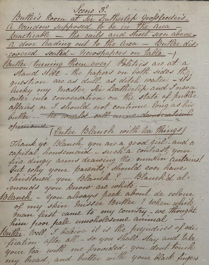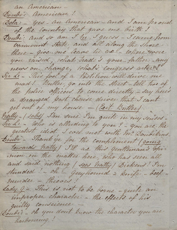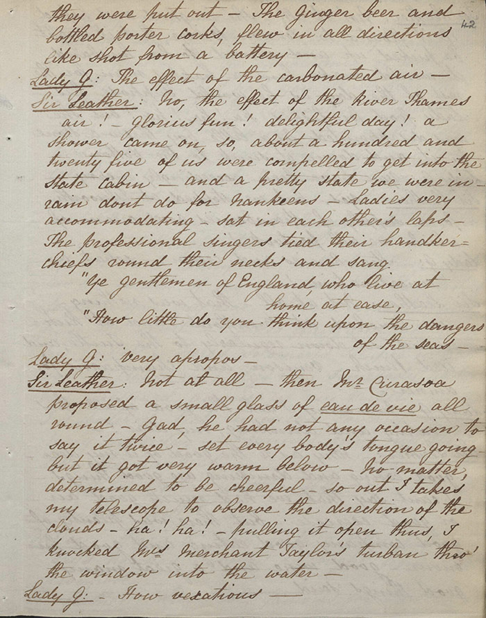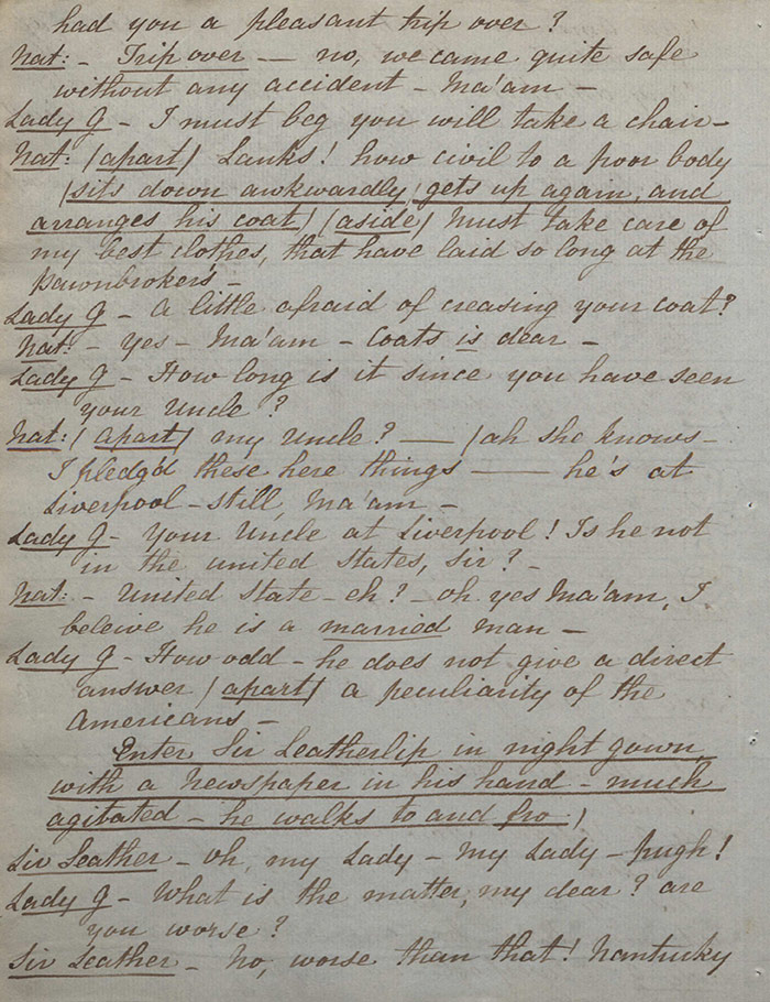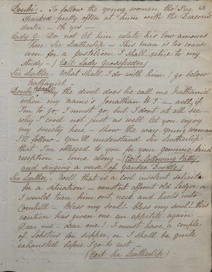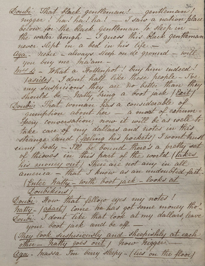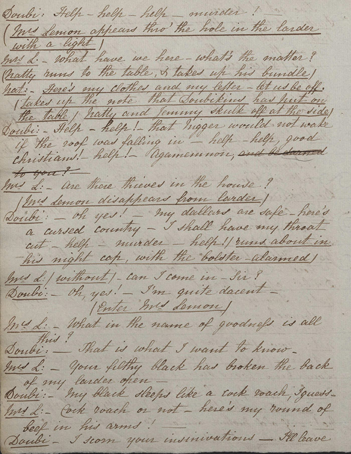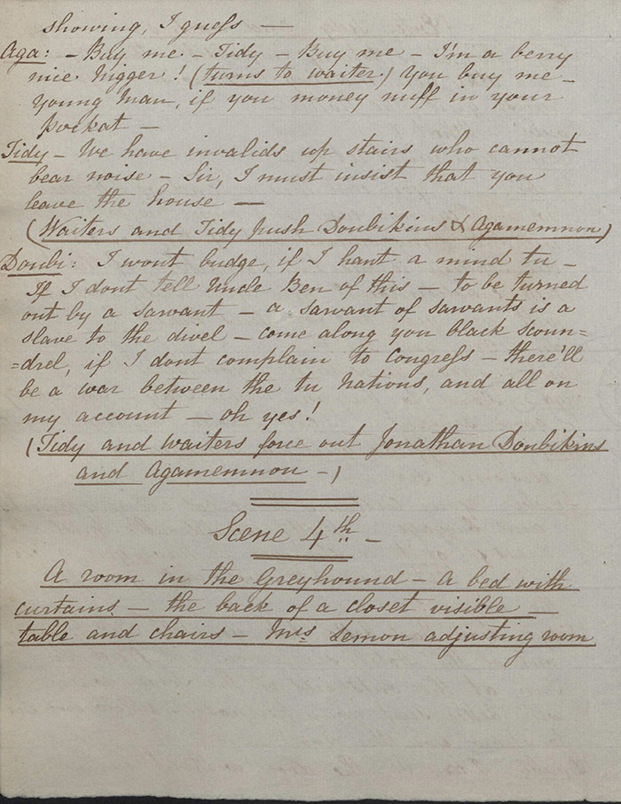 The second scene finds Lady Grossfeeder engrossed in her chemistry studies when Sir Leatherlip interrupts her with an account of his hedonistic trip on a Thames barge where he ate and drank his fill (f.40v). She comments on their differences: ‘you are fond of the effervescence of champagne I am partial to the effervescence of wit!’ [f. 43r] before the Butler announces the arrival of Natty (in fact, Jonathan). As Sir Leatherlip believes him to be there for the postilion position, the scene is understandably confused with Lady Grossfeeder shocked at Jonathan’s forward manner. But as Ledger has vouched for him, Sir Leatherlip feels obliged to give him a trial and send him downstairs. The Butler is downstairs reading newspapers when Blanch enters and he comments on her black skin colour (f.45v). Jonathan arrives and he and the Butler have a brief discussion of politics which leads Jonathan to believe the Butler is an MP. When Blanch sits down with them he is appalled. Agamemnon enters and is attracted to Blanch to the point that Jonathan tries to sell him to the Butler before he is summoned by Sir Leatherlip. Blanch and Agamemnon are left alone and she tells him that as there is no slavery in Britain, he is free. They retire together for romantic purposes. Delapierre is in Lady Grossfeeder’s chambers attempting to see Mary (f.51r). He exits when she approaches with her servant, Patty. Jonathan Doubikins (in fact, Natty) has now arrived and she interviews him at Sir Leatherlip’s request as he is ill from overindulgence. Their exchange is awkward and stilted thanks to the misunderstanding when Sir Leatherlip enters with disastrous news that Mary’s fortune, invested in American stock, has been wiped out. Jonathan enters and his dialogue with Leatherlip becomes heated: Jonathan is affronted at the other’s lack of hospitality while Leatherlip is appalled at his cocksure manner so at odds at what he expects from a postilion. Finally, Jonathan lights a cigar from Lady Grossfeeder’s gasometer which explodes. Delapierre, Mary, Butler, and Patty come running. Sir Leatherlip tells Delapierre of the change in Mary’s fortune which he rejoices in as it allows him to prove his love for her was true. Subsequently, everyone’s real identity is revealed before Agamemnon and Blanch clatter out of the closet. In a somewhat rushed ending, Agamemnon reproves his former owner before Jonathan chuckles at the paragraph which he says was inserted falsely by his uncle in order to benefit from stock speculation. He in turn is also lambasted by Delapierre for the ‘most nefarious species of gambling’ (f.57r) before Sir Leatherlip calls for harmony and welcomes both Americans to London.