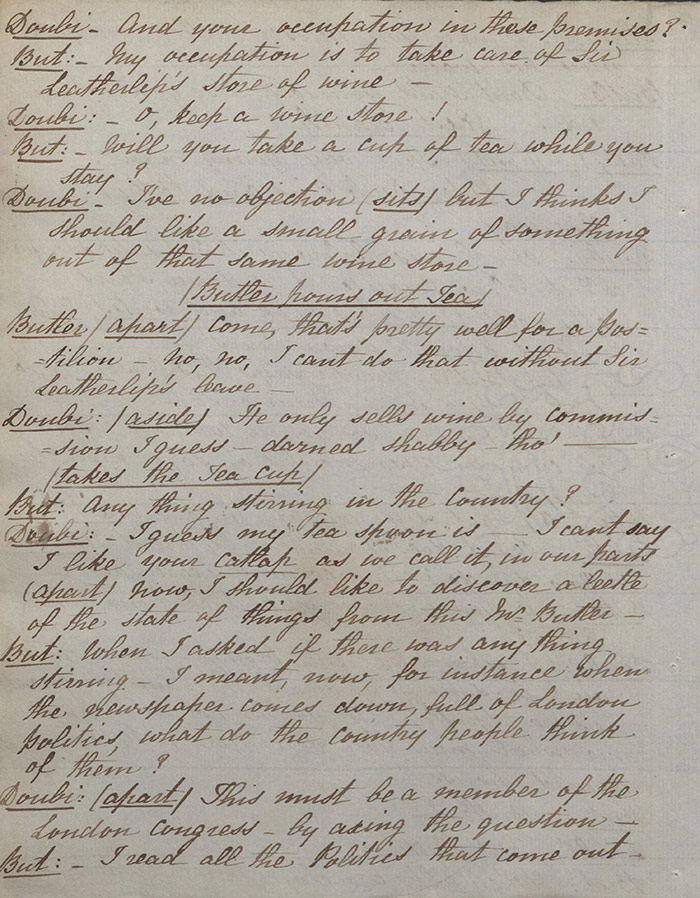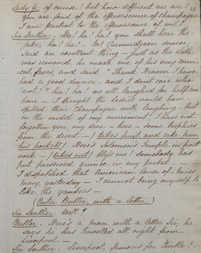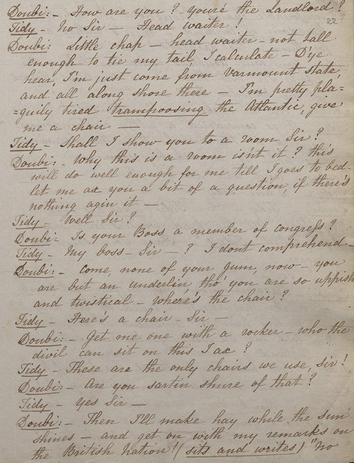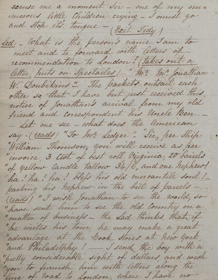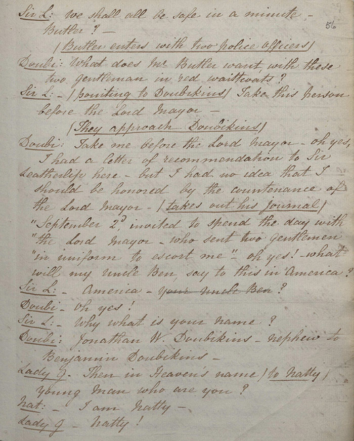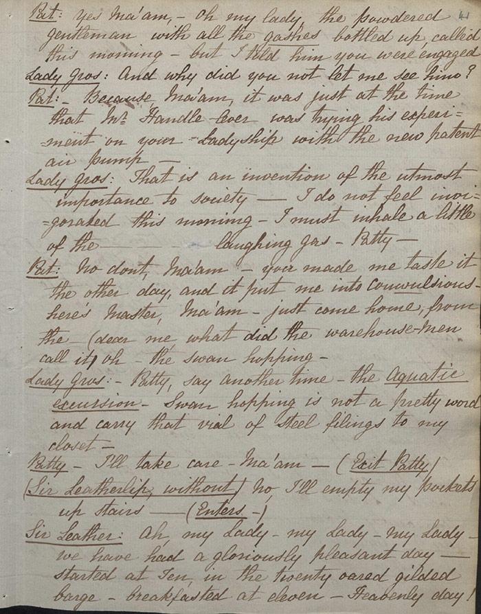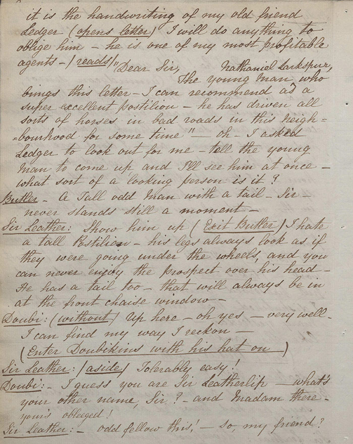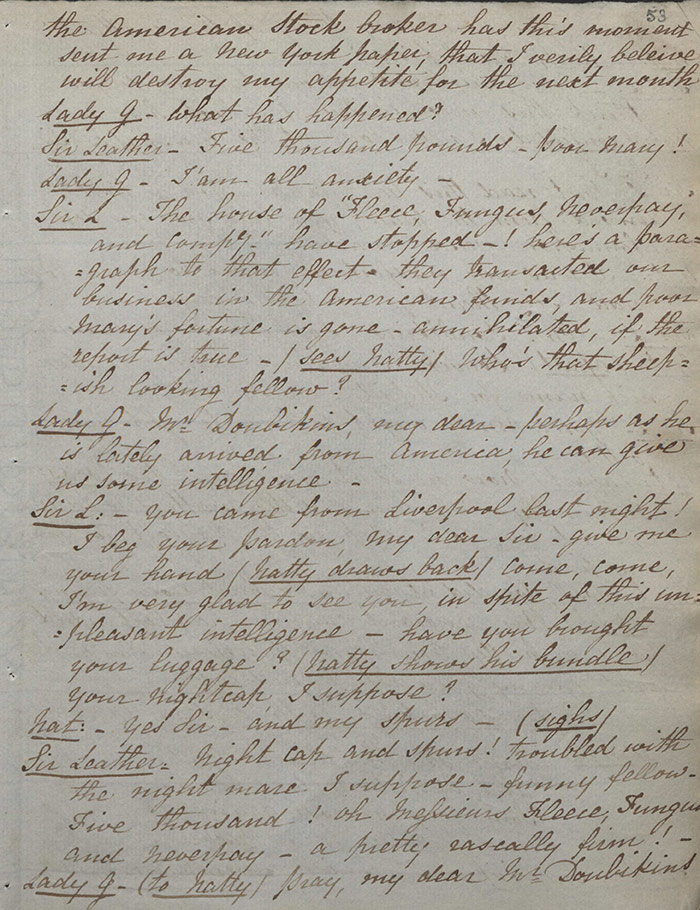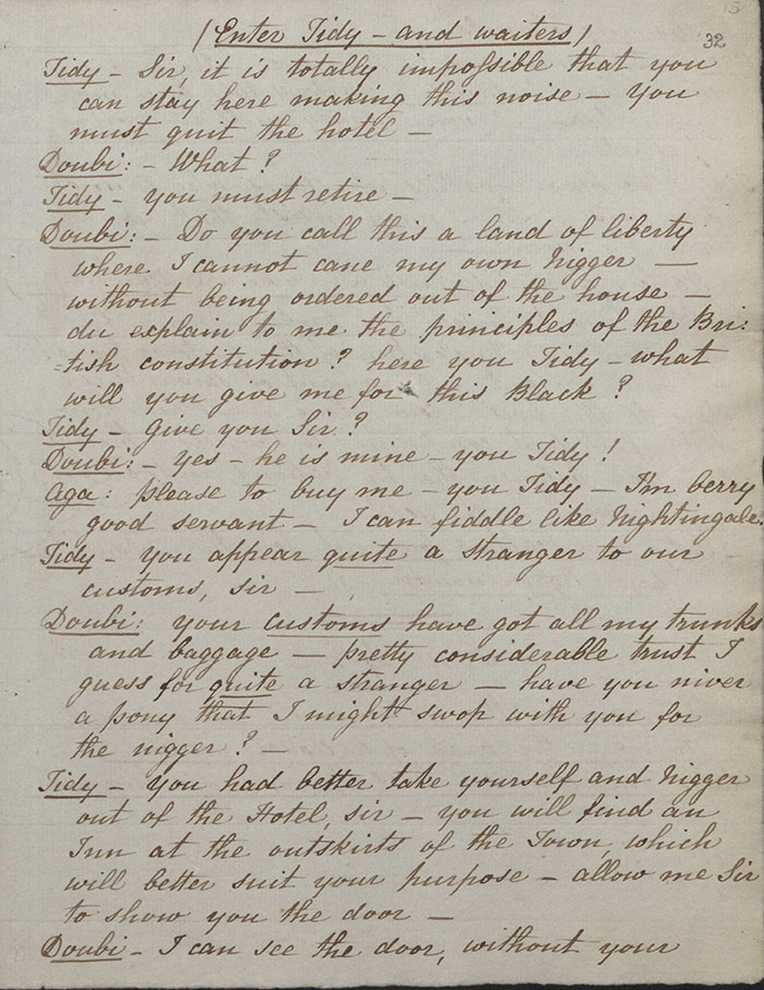 The second scene finds Lady Grossfeeder engrossed in her chemistry studies when Sir Leatherlip interrupts her with an account of his hedonistic trip on a Thames barge where he ate and drank his fill (f.40v). She comments on their differences: ‘you are fond of the effervescence of champagne I am partial to the effervescence of wit!’ [f. 43r] before the Butler announces the arrival of Natty (in fact, Jonathan). As Sir Leatherlip believes him to be there for the postilion position, the scene is understandably confused with Lady Grossfeeder shocked at Jonathan’s forward manner. But as Ledger has vouched for him, Sir Leatherlip feels obliged to give him a trial and send him downstairs. The Butler is downstairs reading newspapers when Blanch enters and he comments on her black skin colour (f.45v). Jonathan arrives and he and the Butler have a brief discussion of politics which leads Jonathan to believe the Butler is an MP. When Blanch sits down with them he is appalled. Agamemnon enters and is attracted to Blanch to the point that Jonathan tries to sell him to the Butler before he is summoned by Sir Leatherlip. Blanch and Agamemnon are left alone and she tells him that as there is no slavery in Britain, he is free. They retire together for romantic purposes. Delapierre is in Lady Grossfeeder’s chambers attempting to see Mary (f.51r). He exits when she approaches with her servant, Patty. Jonathan Doubikins (in fact, Natty) has now arrived and she interviews him at Sir Leatherlip’s request as he is ill from overindulgence. Their exchange is awkward and stilted thanks to the misunderstanding when Sir Leatherlip enters with disastrous news that Mary’s fortune, invested in American stock, has been wiped out. Jonathan enters and his dialogue with Leatherlip becomes heated: Jonathan is affronted at the other’s lack of hospitality while Leatherlip is appalled at his cocksure manner so at odds at what he expects from a postilion. Finally, Jonathan lights a cigar from Lady Grossfeeder’s gasometer which explodes. Delapierre, Mary, Butler, and Patty come running. Sir Leatherlip tells Delapierre of the change in Mary’s fortune which he rejoices in as it allows him to prove his love for her was true. Subsequently, everyone’s real identity is revealed before Agamemnon and Blanch clatter out of the closet. In a somewhat rushed ending, Agamemnon reproves his former owner before Jonathan chuckles at the paragraph which he says was inserted falsely by his uncle in order to benefit from stock speculation. He in turn is also lambasted by Delapierre for the ‘most nefarious species of gambling’ (f.57r) before Sir Leatherlip calls for harmony and welcomes both Americans to London.