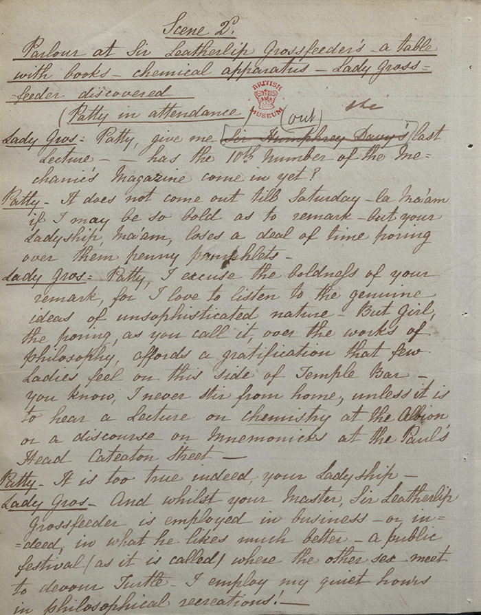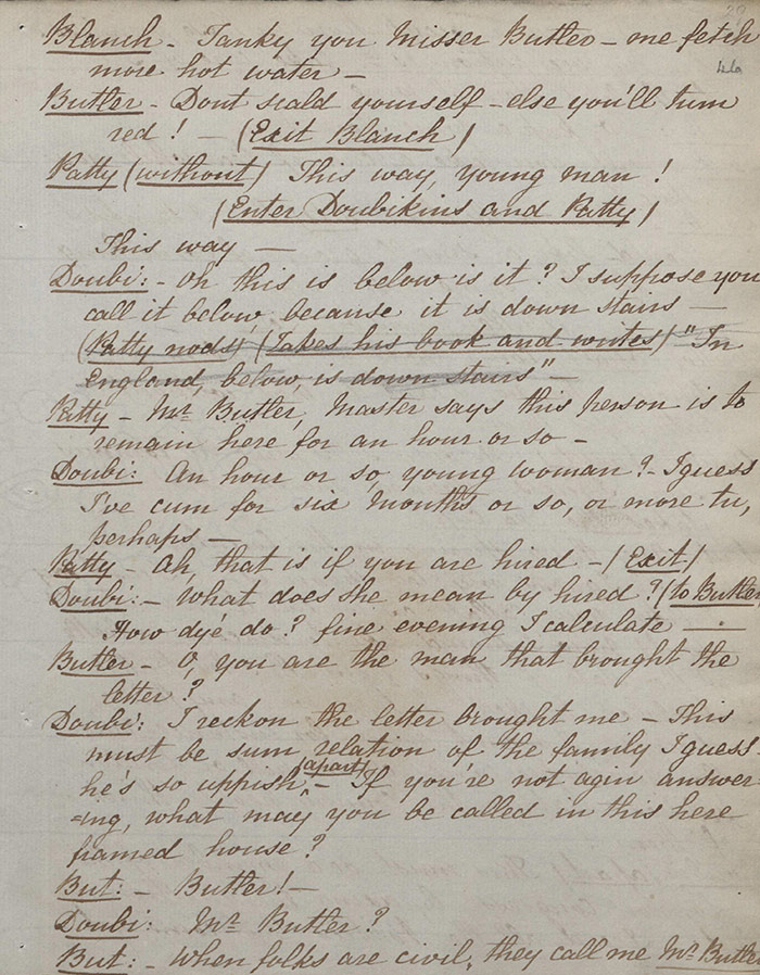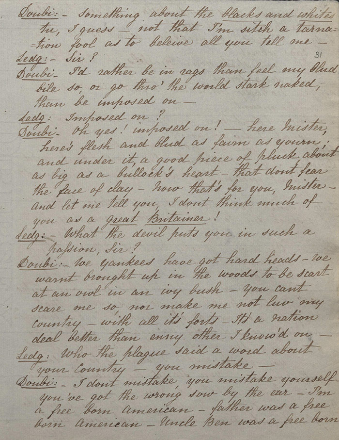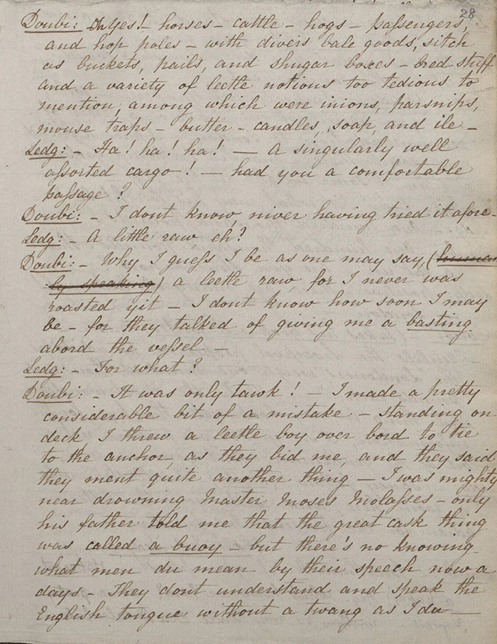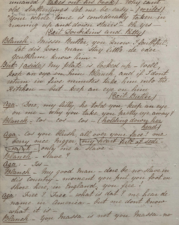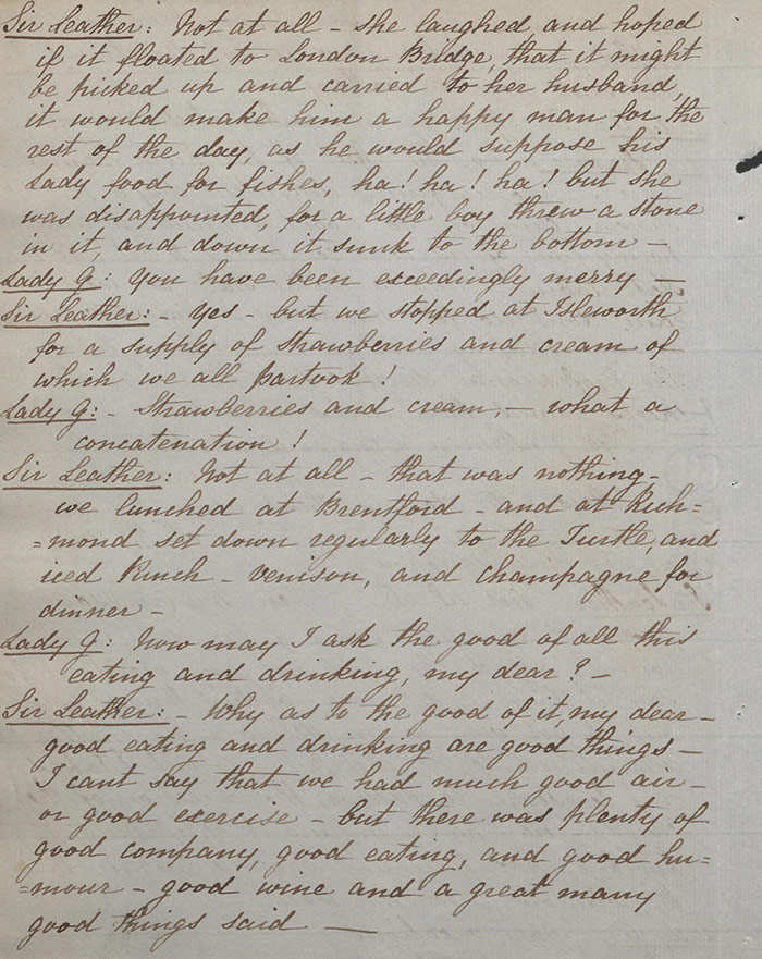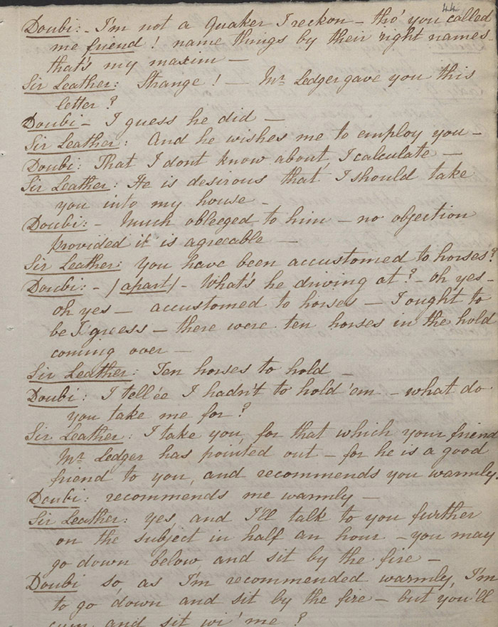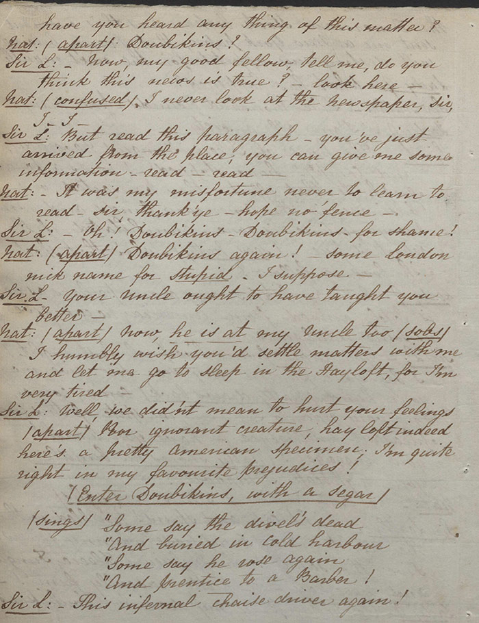 The second scene finds Lady Grossfeeder engrossed in her chemistry studies when Sir Leatherlip interrupts her with an account of his hedonistic trip on a Thames barge where he ate and drank his fill (f.40v). She comments on their differences: ‘you are fond of the effervescence of champagne I am partial to the effervescence of wit!’ [f. 43r] before the Butler announces the arrival of Natty (in fact, Jonathan). As Sir Leatherlip believes him to be there for the postilion position, the scene is understandably confused with Lady Grossfeeder shocked at Jonathan’s forward manner. But as Ledger has vouched for him, Sir Leatherlip feels obliged to give him a trial and send him downstairs. The Butler is downstairs reading newspapers when Blanch enters and he comments on her black skin colour (f.45v). Jonathan arrives and he and the Butler have a brief discussion of politics which leads Jonathan to believe the Butler is an MP. When Blanch sits down with them he is appalled. Agamemnon enters and is attracted to Blanch to the point that Jonathan tries to sell him to the Butler before he is summoned by Sir Leatherlip. Blanch and Agamemnon are left alone and she tells him that as there is no slavery in Britain, he is free. They retire together for romantic purposes. Delapierre is in Lady Grossfeeder’s chambers attempting to see Mary (f.51r). He exits when she approaches with her servant, Patty. Jonathan Doubikins (in fact, Natty) has now arrived and she interviews him at Sir Leatherlip’s request as he is ill from overindulgence. Their exchange is awkward and stilted thanks to the misunderstanding when Sir Leatherlip enters with disastrous news that Mary’s fortune, invested in American stock, has been wiped out. Jonathan enters and his dialogue with Leatherlip becomes heated: Jonathan is affronted at the other’s lack of hospitality while Leatherlip is appalled at his cocksure manner so at odds at what he expects from a postilion. Finally, Jonathan lights a cigar from Lady Grossfeeder’s gasometer which explodes. Delapierre, Mary, Butler, and Patty come running. Sir Leatherlip tells Delapierre of the change in Mary’s fortune which he rejoices in as it allows him to prove his love for her was true. Subsequently, everyone’s real identity is revealed before Agamemnon and Blanch clatter out of the closet. In a somewhat rushed ending, Agamemnon reproves his former owner before Jonathan chuckles at the paragraph which he says was inserted falsely by his uncle in order to benefit from stock speculation. He in turn is also lambasted by Delapierre for the ‘most nefarious species of gambling’ (f.57r) before Sir Leatherlip calls for harmony and welcomes both Americans to London.