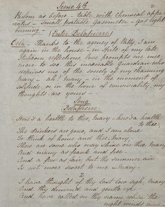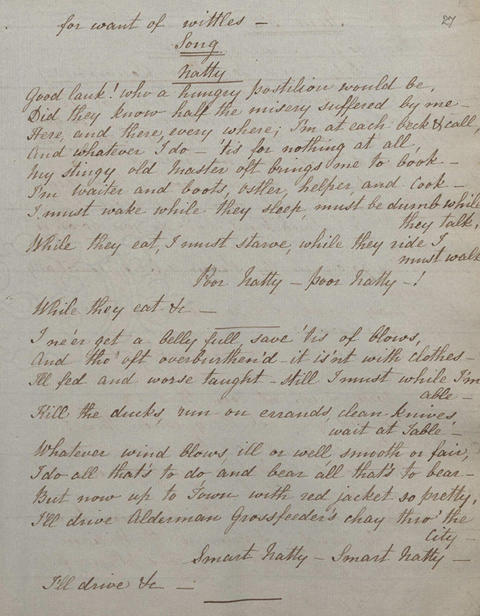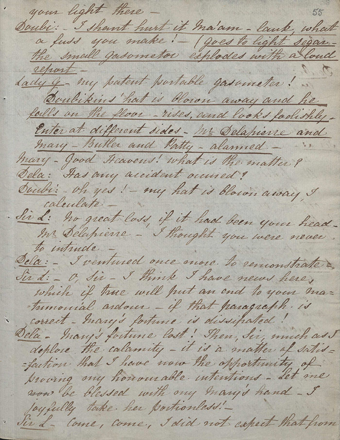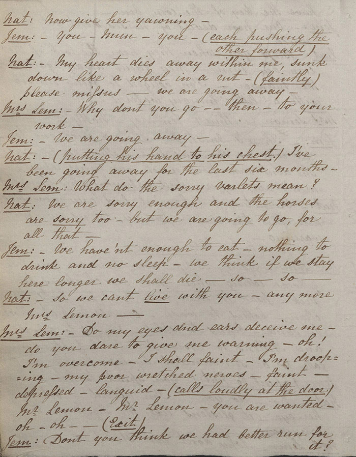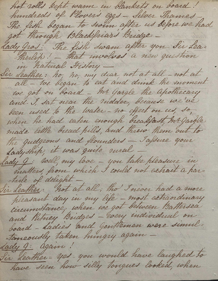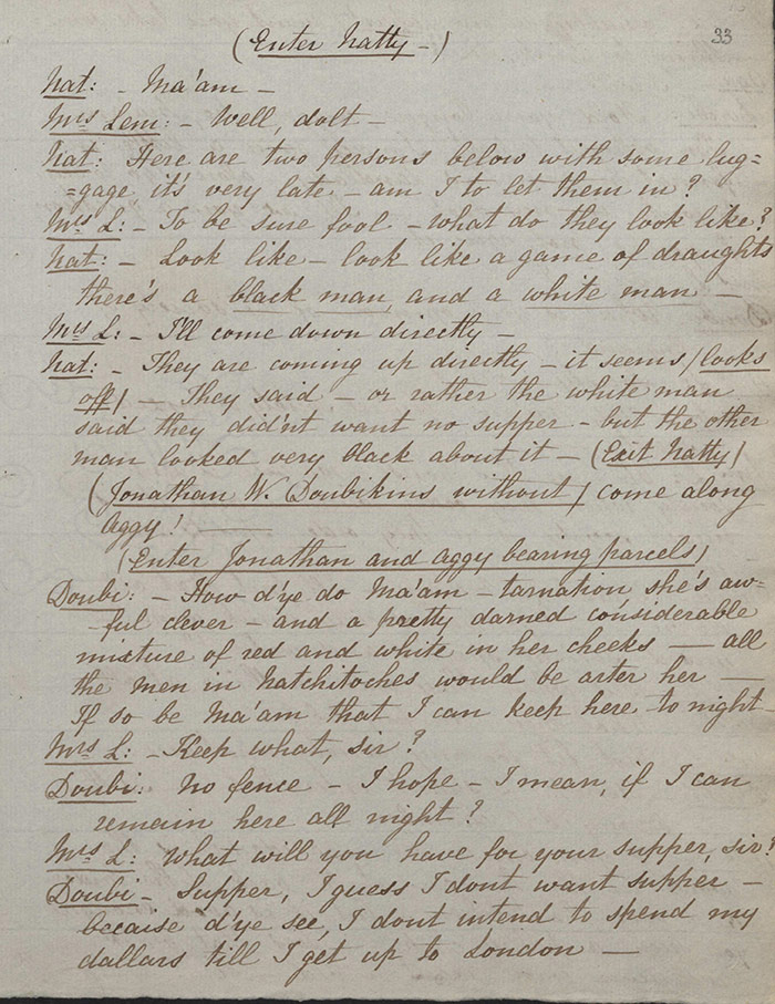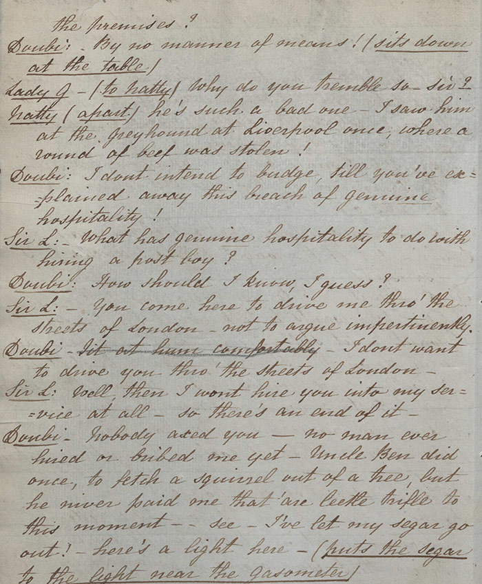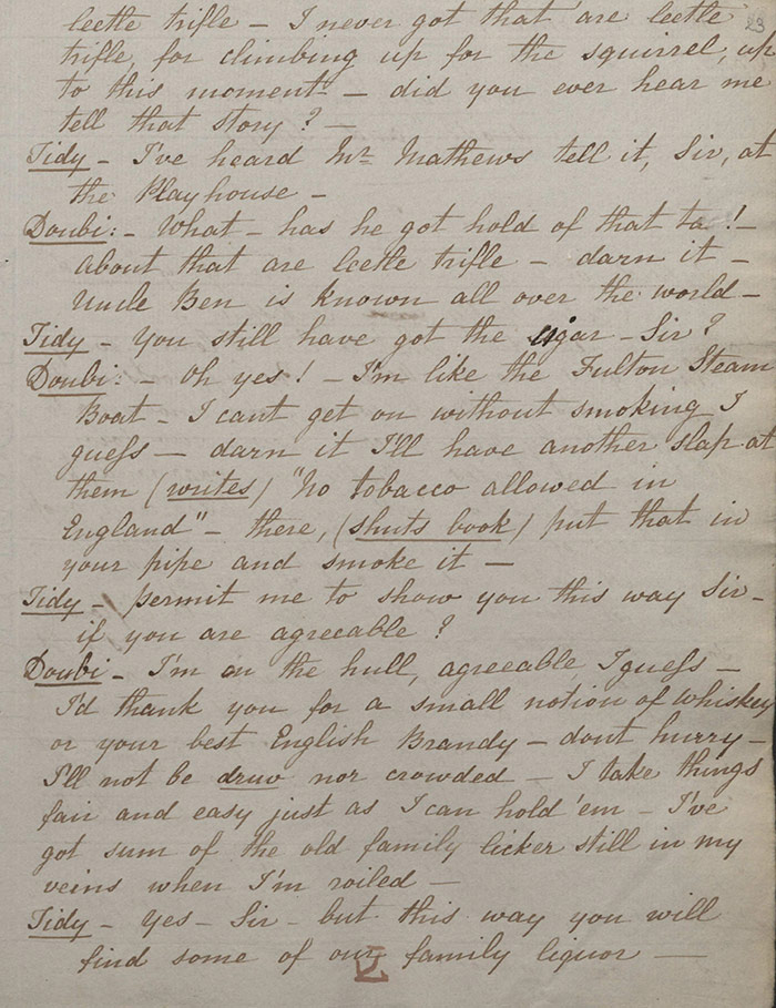 The second scene finds Lady Grossfeeder engrossed in her chemistry studies when Sir Leatherlip interrupts her with an account of his hedonistic trip on a Thames barge where he ate and drank his fill (f.40v). She comments on their differences: ‘you are fond of the effervescence of champagne I am partial to the effervescence of wit!’ [f. 43r] before the Butler announces the arrival of Natty (in fact, Jonathan). As Sir Leatherlip believes him to be there for the postilion position, the scene is understandably confused with Lady Grossfeeder shocked at Jonathan’s forward manner. But as Ledger has vouched for him, Sir Leatherlip feels obliged to give him a trial and send him downstairs. The Butler is downstairs reading newspapers when Blanch enters and he comments on her black skin colour (f.45v). Jonathan arrives and he and the Butler have a brief discussion of politics which leads Jonathan to believe the Butler is an MP. When Blanch sits down with them he is appalled. Agamemnon enters and is attracted to Blanch to the point that Jonathan tries to sell him to the Butler before he is summoned by Sir Leatherlip. Blanch and Agamemnon are left alone and she tells him that as there is no slavery in Britain, he is free. They retire together for romantic purposes. Delapierre is in Lady Grossfeeder’s chambers attempting to see Mary (f.51r). He exits when she approaches with her servant, Patty. Jonathan Doubikins (in fact, Natty) has now arrived and she interviews him at Sir Leatherlip’s request as he is ill from overindulgence. Their exchange is awkward and stilted thanks to the misunderstanding when Sir Leatherlip enters with disastrous news that Mary’s fortune, invested in American stock, has been wiped out. Jonathan enters and his dialogue with Leatherlip becomes heated: Jonathan is affronted at the other’s lack of hospitality while Leatherlip is appalled at his cocksure manner so at odds at what he expects from a postilion. Finally, Jonathan lights a cigar from Lady Grossfeeder’s gasometer which explodes. Delapierre, Mary, Butler, and Patty come running. Sir Leatherlip tells Delapierre of the change in Mary’s fortune which he rejoices in as it allows him to prove his love for her was true. Subsequently, everyone’s real identity is revealed before Agamemnon and Blanch clatter out of the closet. In a somewhat rushed ending, Agamemnon reproves his former owner before Jonathan chuckles at the paragraph which he says was inserted falsely by his uncle in order to benefit from stock speculation. He in turn is also lambasted by Delapierre for the ‘most nefarious species of gambling’ (f.57r) before Sir Leatherlip calls for harmony and welcomes both Americans to London.