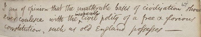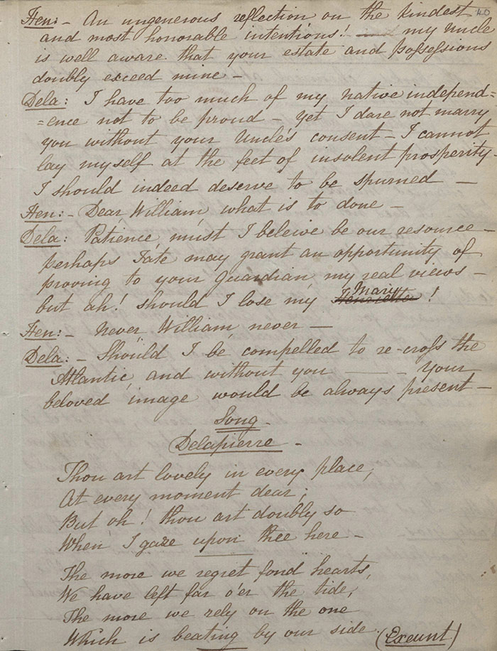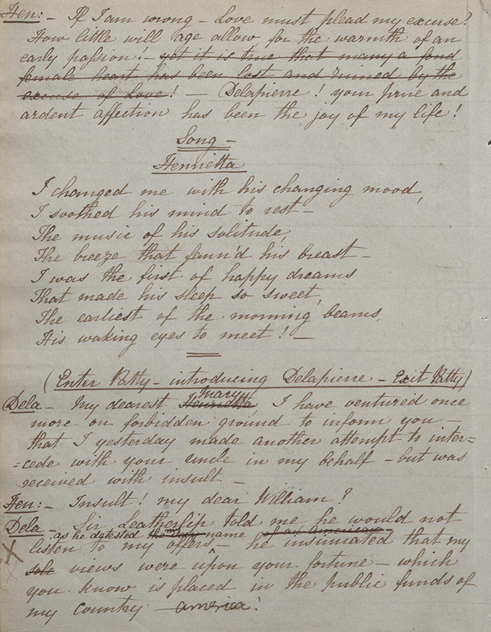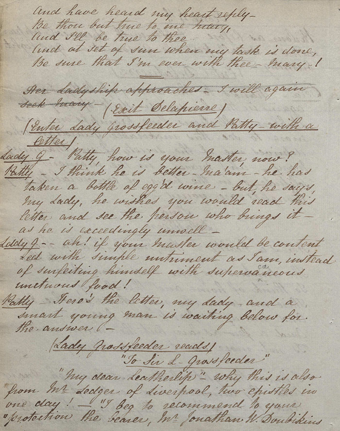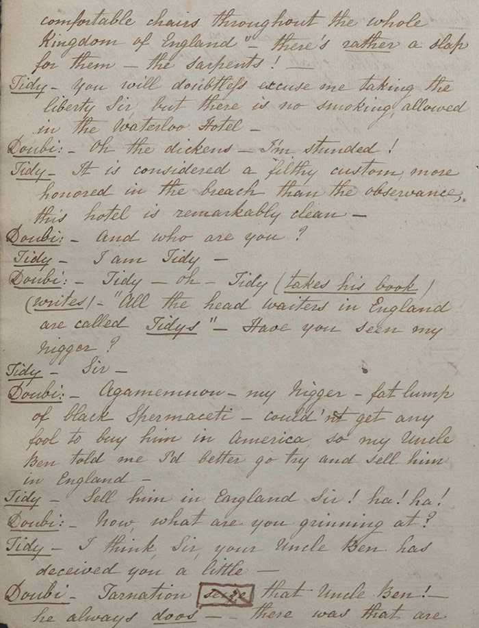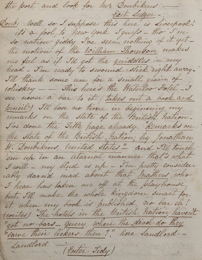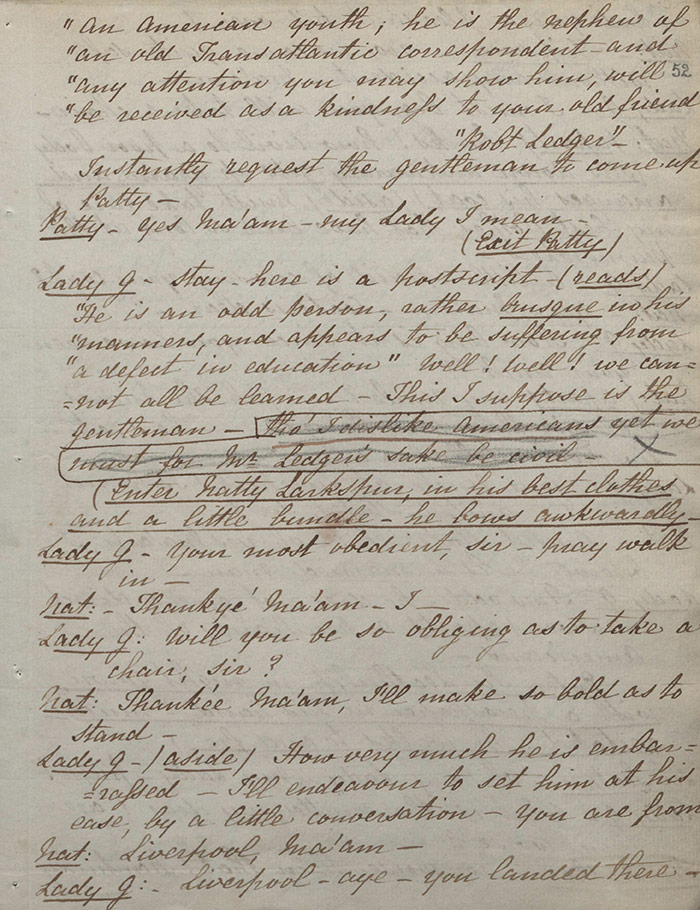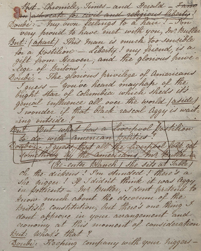 Some passages of text were marked out in red ink, black ink, and pencil as if to signal universal agreement (and perhaps contrition on the part of the manager/author) that these were not fit words to be spoken on the stage. We have an instance of ‘darned’ (f.36v) as well as a passage related to politics: ‘But what has a Liverpool postilion to do with American politics?’ (f.47r), probably a reference to the Prime Minister, the Earl of Liverpool although it is possibly to Canning, long associated with the city. See also the passage on politics deleted on the same folio and the replacement text inserted above. Attention was also paid to comments which passed blanket negative judgments on Americans such as that made by Lady Grossfeeder (f.52r).