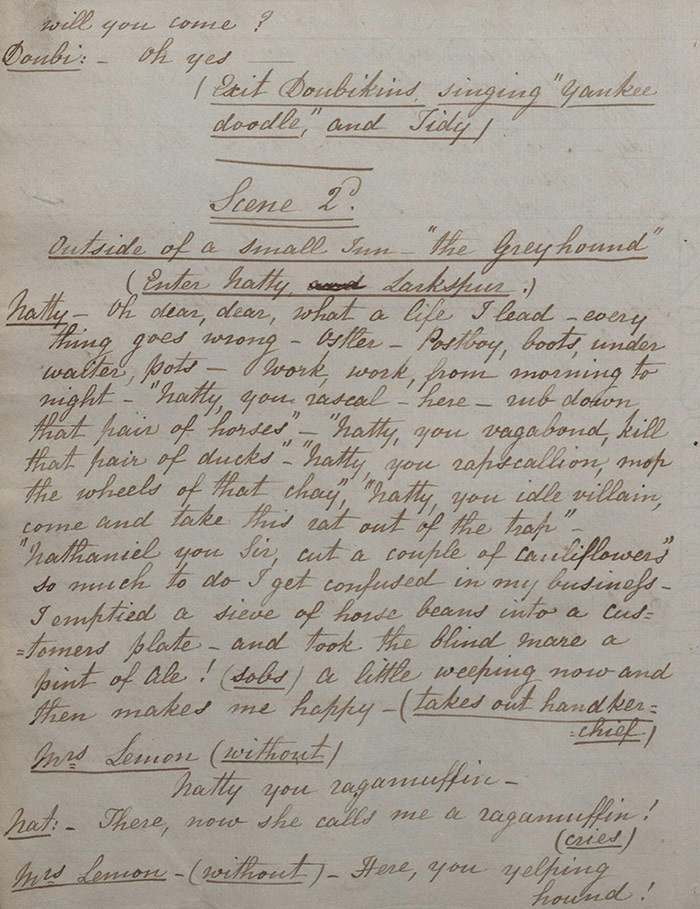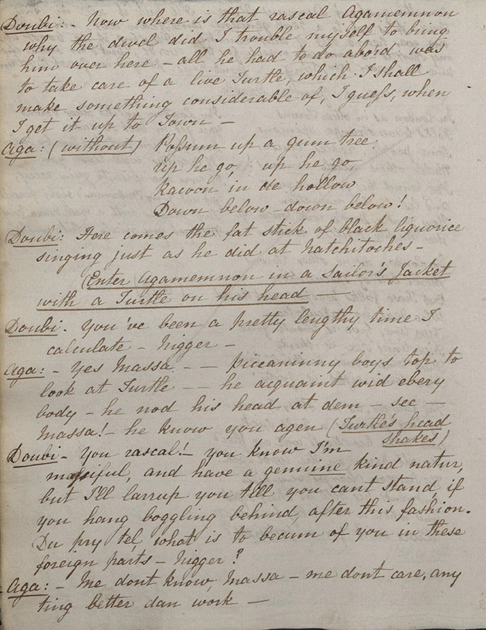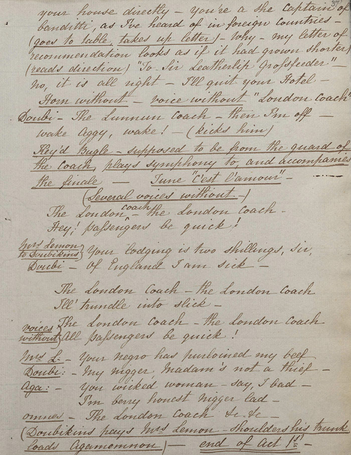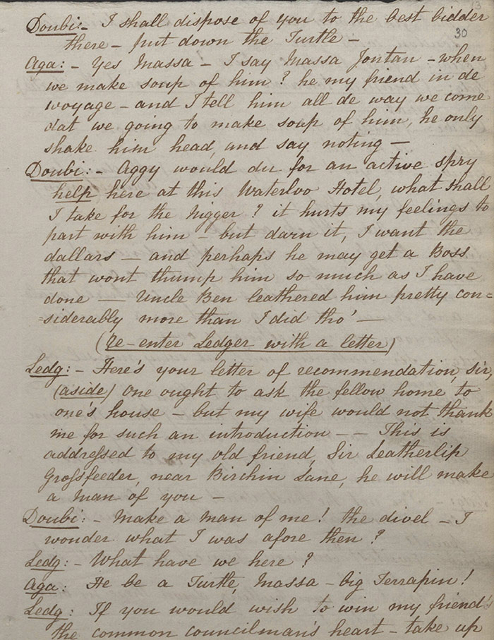 Mr Ledger returns to the Waterloo hotel and finally identifies Jonathan as the man he was looking for (f.27v). He writes him a letter of introduction for Sir Leatherlip Grossfeeder while Doubikins sings a version of Yankee Doodle. Agamemnon arrives ‘in a Sailor’s Jacket with a Turtle on his Head’ (f.31v) and Jonathan vents his frustration at his supposed laggardness. A comic exchange follows when Ledger encourages him to take the turtle to London to be eaten by Sir Leatherlip and Jonathan thinks he is pointing to Agamemnon and trying to trick him. The two descend into argument as Jonathan’s patriotic ire is raised; when he then physically chastises Agamemnon to tears, Tidy enters and asks him to desist. Jonathan retorts ‘Do you call this a land of liberty where I cannot cane my own N___ – without being ordered out of the house’ (f.32r). Tidy eventually bundles him out of the hotel. Scene 4 finds Jonathan and Agamemnon arrive at the Greyhound where Natty introduces them to Mrs Lemon (f.32v). She is underwhelmed by the brash American and gives him the worst room in the house – the one that is to be targeted by Natty and Jemmy that night. Later that night, Natty sneaks into the room but he disturbs Jonathan who causes an uproar. In the confusion, Natty escapes with some beef, Jonathan leaves the hotel as well, and the letters of introduction get mixed up.