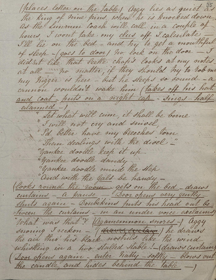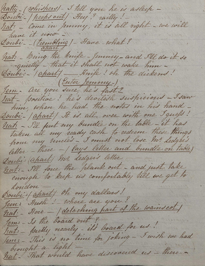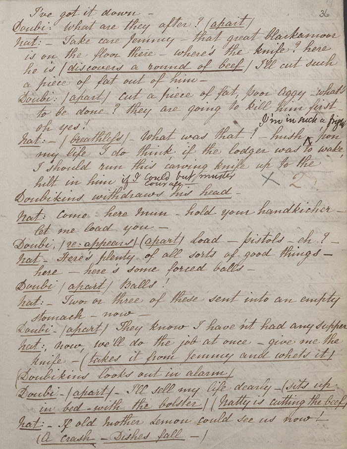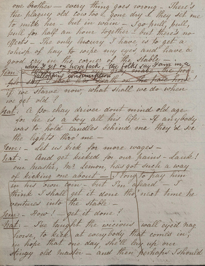 The excisions in red pen are more than likely made by Colman. Notorious for his puritanical intolerance of any scriptural reference on the stage – to the bafflement of many of his contemporaries – the first deletion in red is Jem’s comment that he looks ‘like Death on a pale horse!’ (f.24v), typical of Colman. Some leaves later, we note another deletion in red where simply the word ‘religious’ is scored out of Jonathan’s line ‘But I’ve sum religious doubts – about selling Aggy to be devoured’ (f.30v). It is clear that Colman’s objections go beyond biblical or eschatological references and that any reference to or sense of the spiritual was unwelcome.