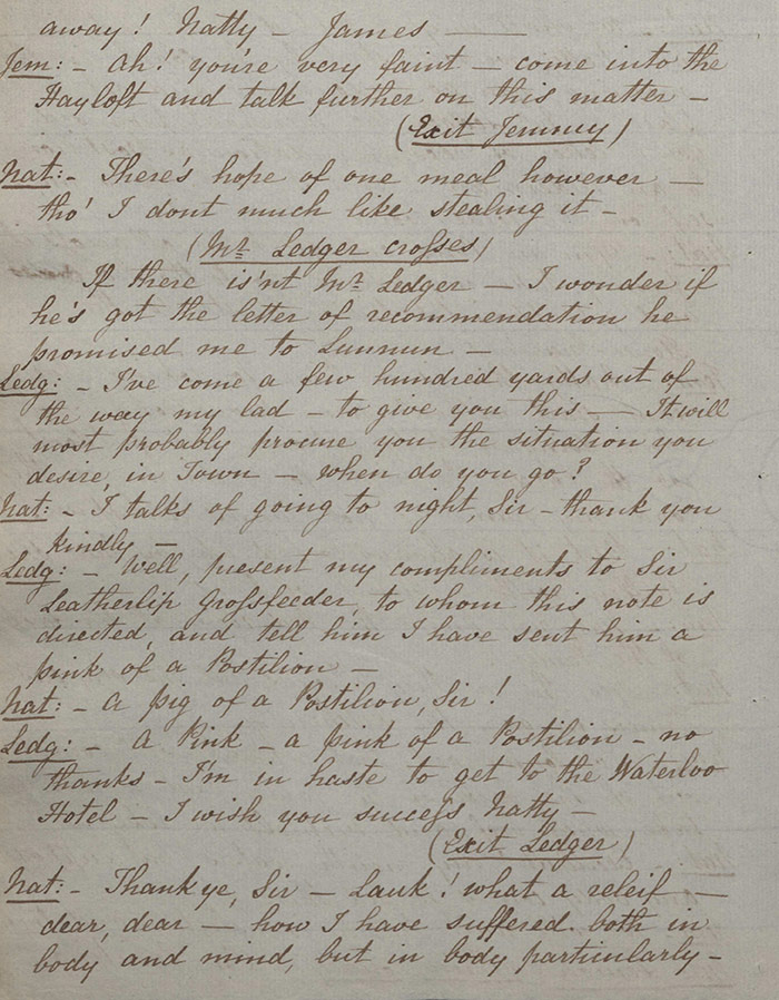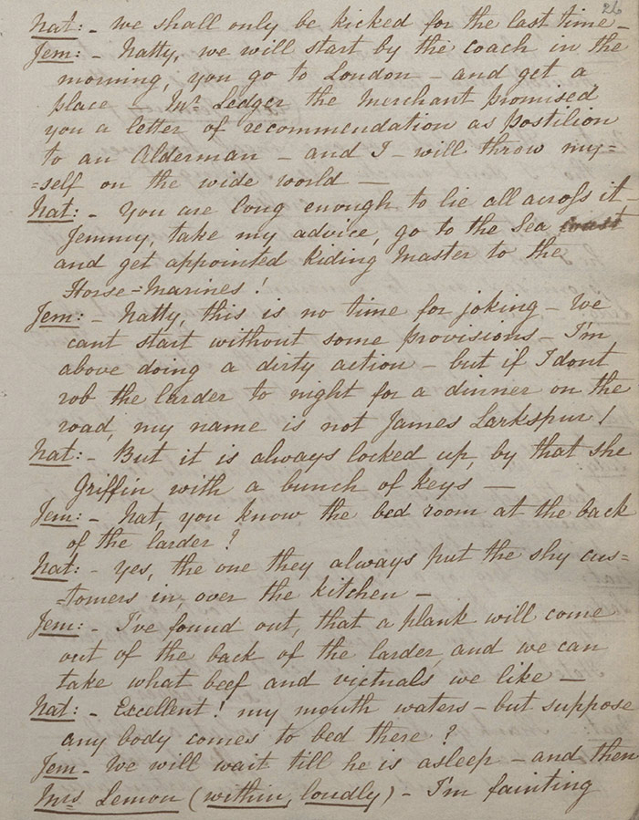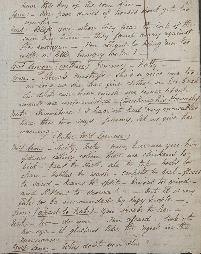 If both Colman and Peake (and also possibly Arnold) used black pen to mark up the manuscript, this raises interesting questions about the origin of other major excisions in the manuscript. A significant deletion occurs on (ff.24v-25r) when a number of lines exchanged between Natty and Jem are deleted which refer to training a horse to kick and ‘lay up our stingy old master’ as well getting the key to the corn bin. References to food shortages, especially corn, were never likely to be approved by the Examiner, a difficult political issue for some years at this point, although it is possible that the manager/author may also have rethought these lines before submission. Anyone with a passing knowledge of the theatre and Colman would have known that he would never sanction a reference, even one somewhat oblique, to the Corn Laws.