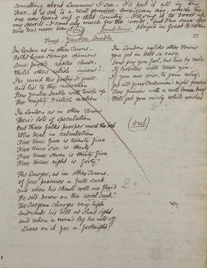 Colman also used his red pen for politically problematic passages as well, objecting to a version of the ‘Yankee Doodle’ song which offered a caustic view on London life (f.29r). On the manuscript we have a diagonal red line through the entire song with ‘(out)’ written in black ink beside it. There may well be particular localized references within this satire (as suggested, for instance, by the underlining of ‘inions’); however, it is more probable that the song’s overall tendency to denigrate London’s commercial, legal, and medical circles and its suggestion that ordinary people get ‘fleeced’ by such elites was enough for it to earn Colman’s disapproval.
