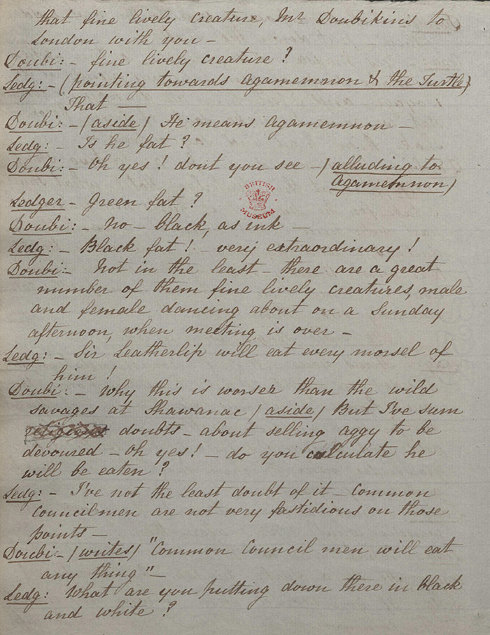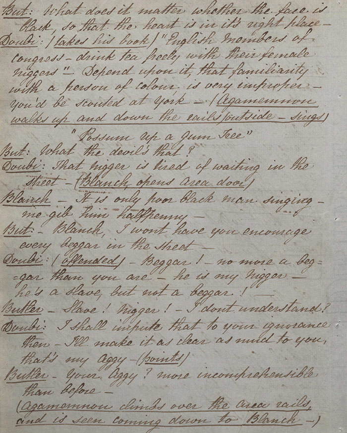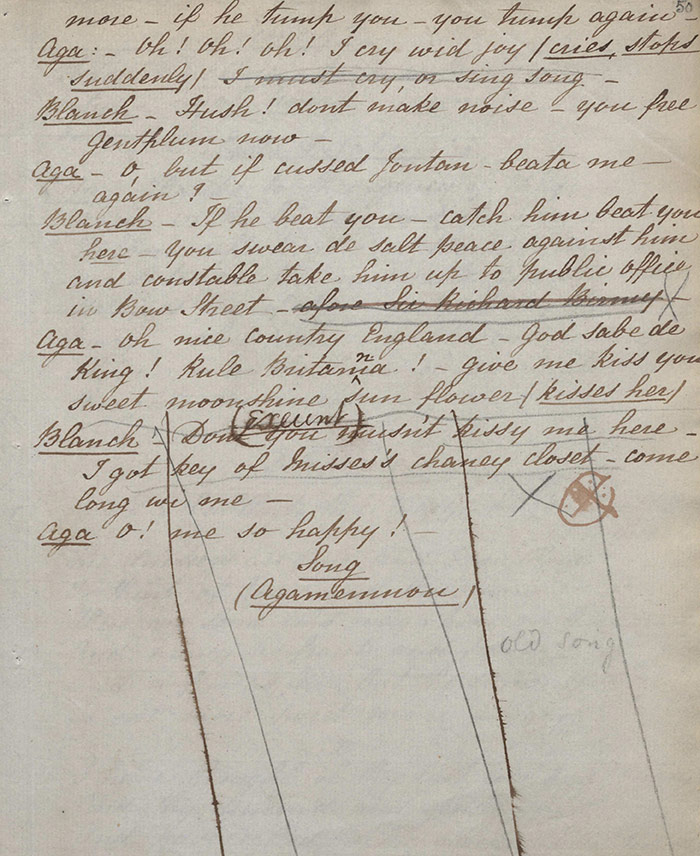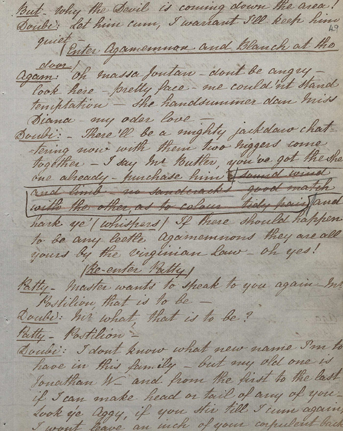 A final curious deletion of red, black, and pencil is the description of Agamemnon and Blanch by Jonathan (f.49r) ‘sound mind and limb – no sandcracks – good match with the other, as to colour – tidy pair’. It would seem that even the comic mimicry of a slave sales-patter would not be acceptable in a post-abolition London. Despite this pseudo-liberal gesture, the play makes clear that black characters were also subject to embargoes as regards references to sexual activity when Blanche invites Agamemnon to join her in a closet for amorous purposes (f.50r).