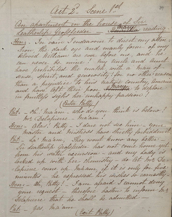 The second act begins at Sir Leatherlip Grossfeeder’s house where his daughter Mary is called upon by William Delapierre, her lover but disdained by her parents as he is American (f.39r). Sadly, he reports that he was rebuffed once again by Sir Leatherlip who believes him – erroneously – to be a fortune-hunter.
